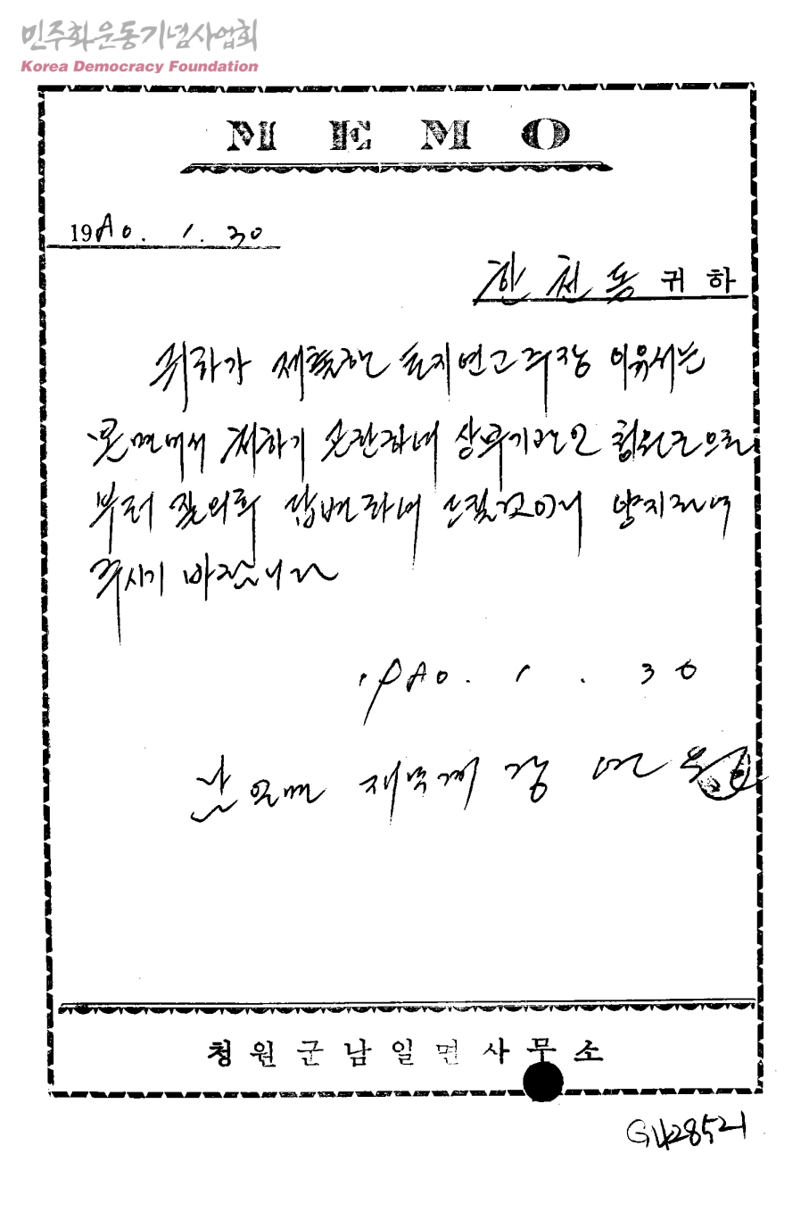 - 남일면사무소에서 한천동씨에게 보내는 메모