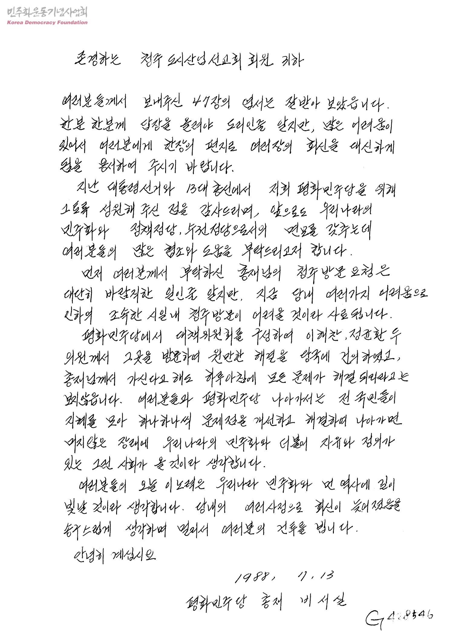 존경하는 청주도시산업선교회 회원 귀하[총재님의 청주방문요청에 대한 답신글,수신:청주도시산업선교회]