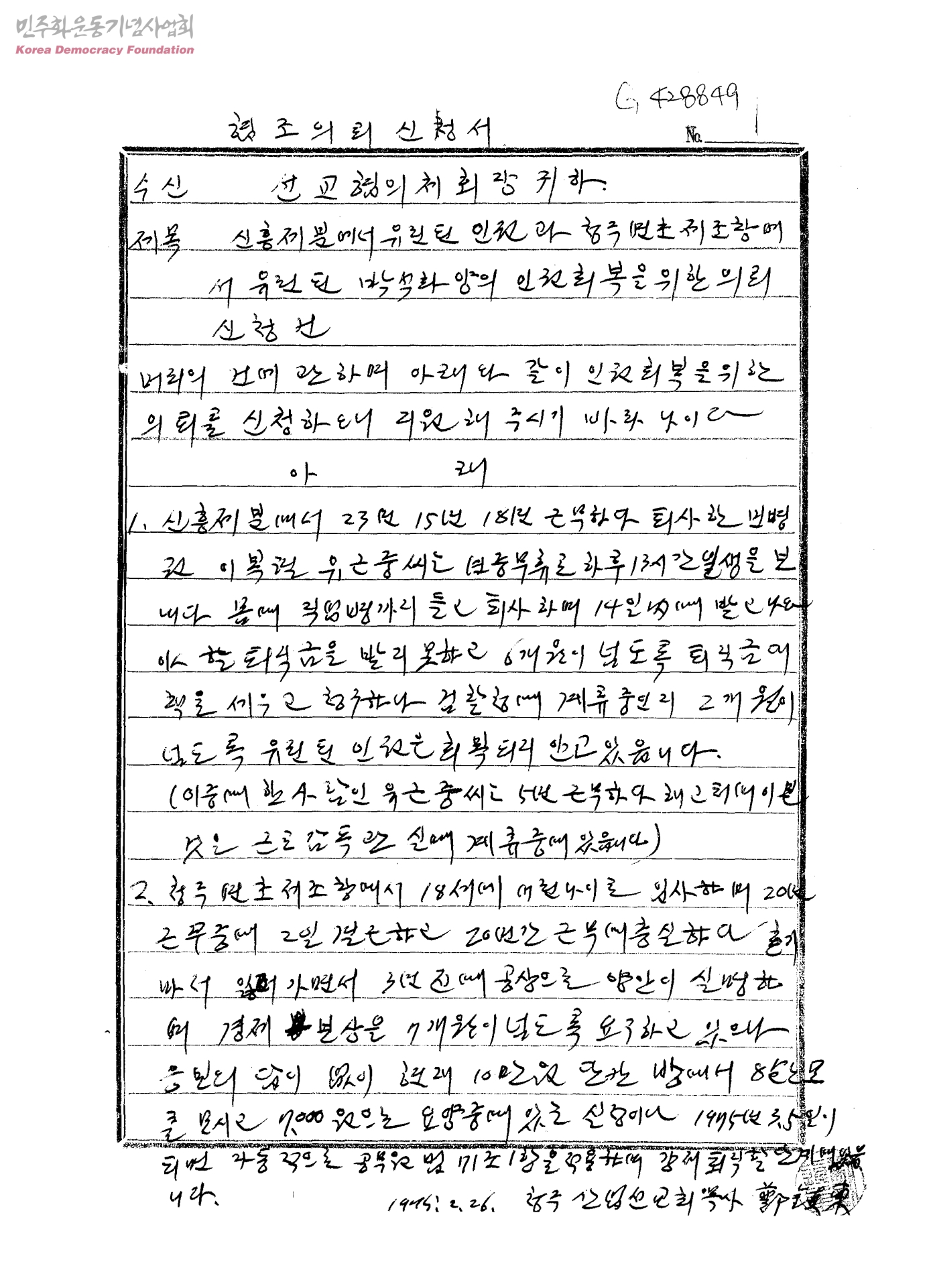 [연초제조창 박석화씨 사건 관련자료]신흥제분에서 유린된 인권과 청주연초제조창에서 유린된 박석화양의 인권회복을 위한 의뢰 신청건[수신:선교협의체회장,발신:정진동]
