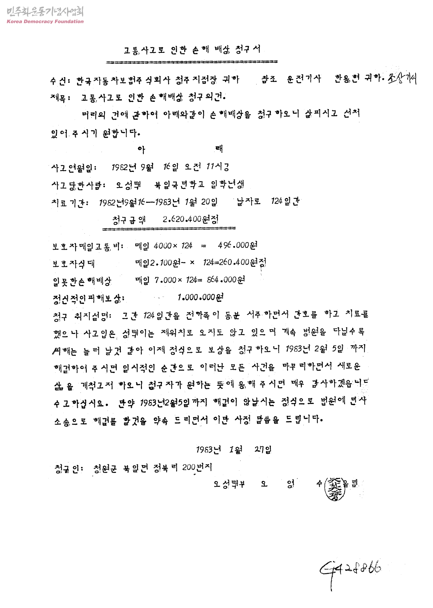 [오영수씨 子 교통사고 손해배상청구 관련자료]교통사고로 인한 손해배상 청구의 건[수신:한국자동차보험 청주지점,발신:오영수]