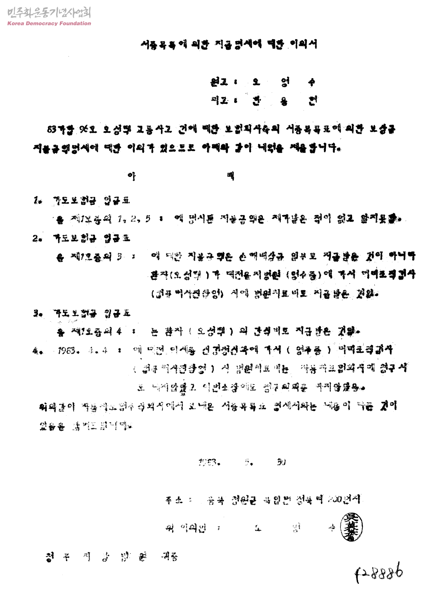 [오영수씨 子 교통사고 손해배상청구 관련자료]서증목록에 의한 지급명세에 대한 이의서[원고:오영수,피고:한용현]