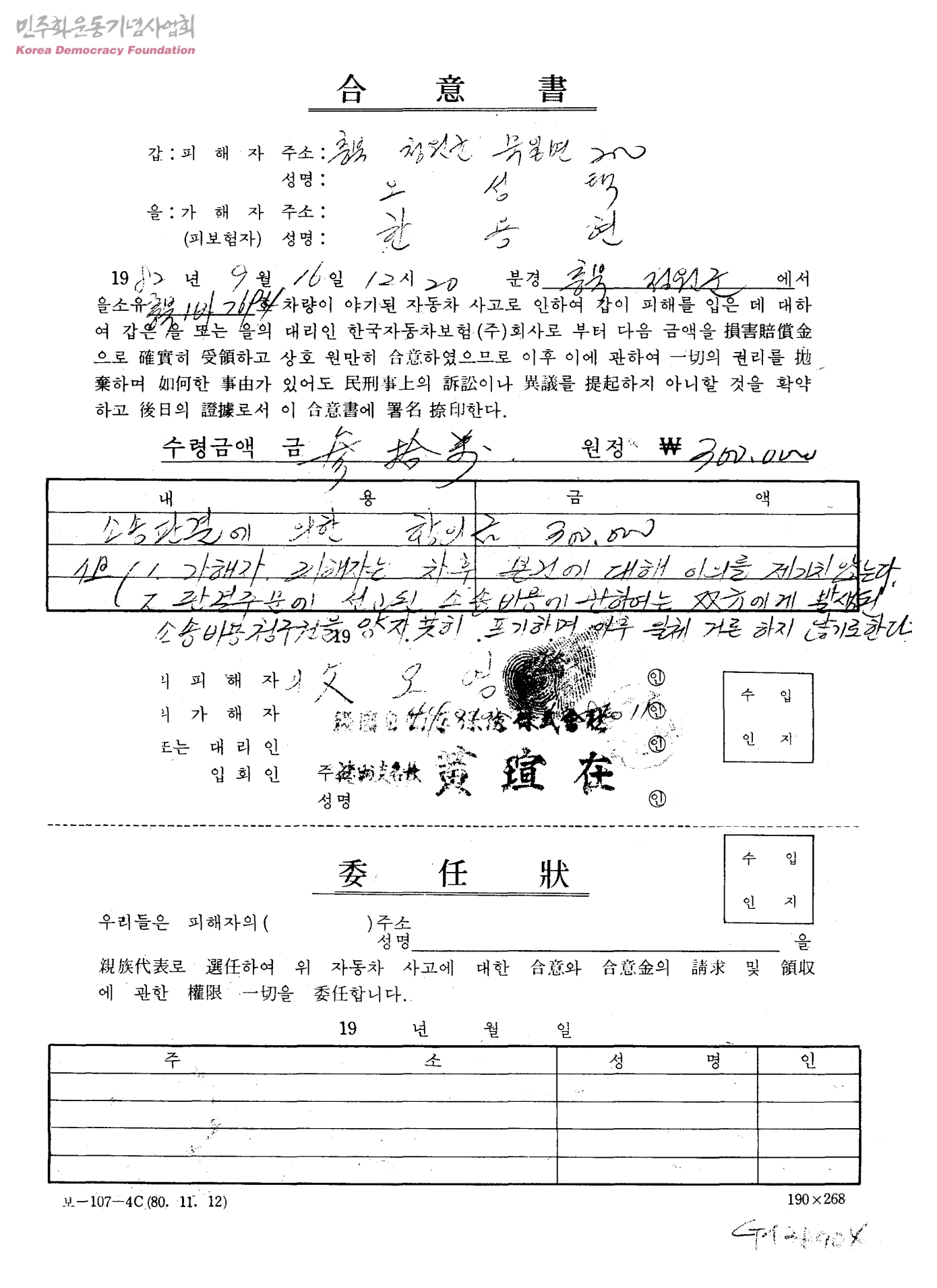 [오영수씨 子 교통사고 손해배상청구 관련자료]合意書-소송판결에 의한 합의금[피해자:오성택,가해자:한용현]