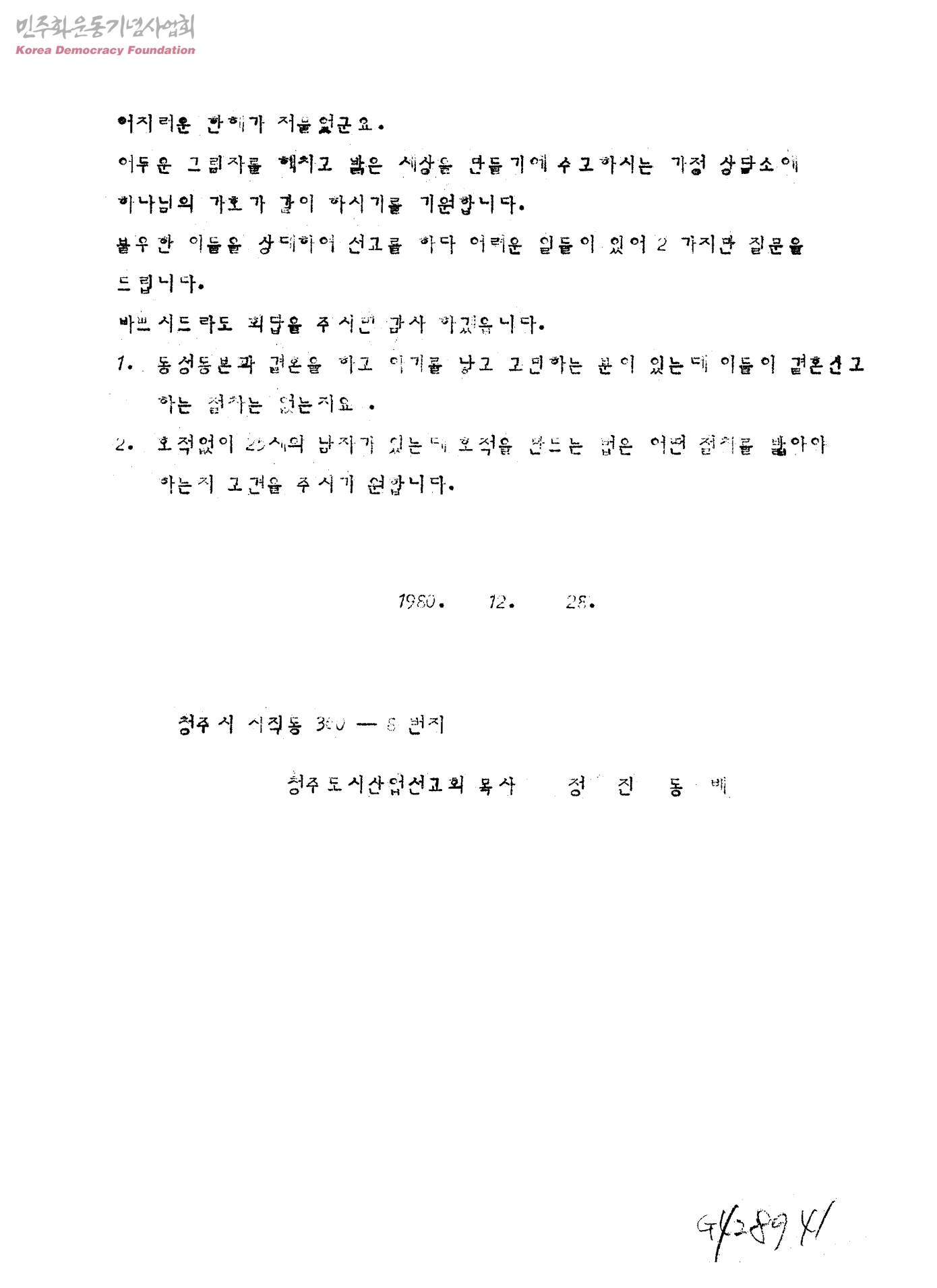 [선교사업 중 어려운 문제에 대한 질의서신-동성동본 혼인신고][수신:한국가정법률상담소,발신:정진동]