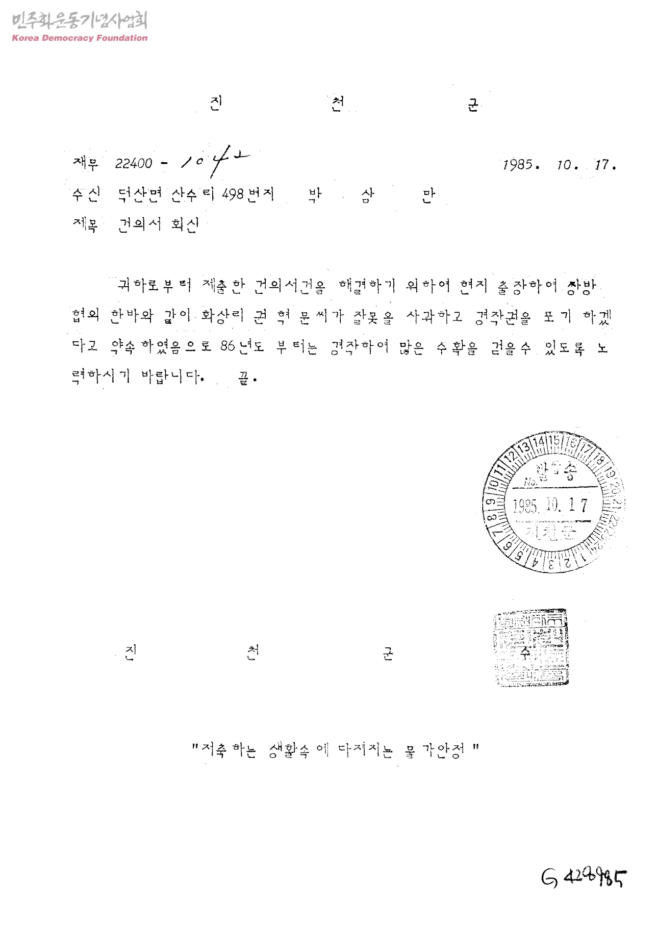[진천덕산 박삼만씨 토지사건 자료]건의서 회신[박상만씨와 권혁문씨 사이의 경작권 사건이 해결되었음][수신:박상만,발신:진천군수]
