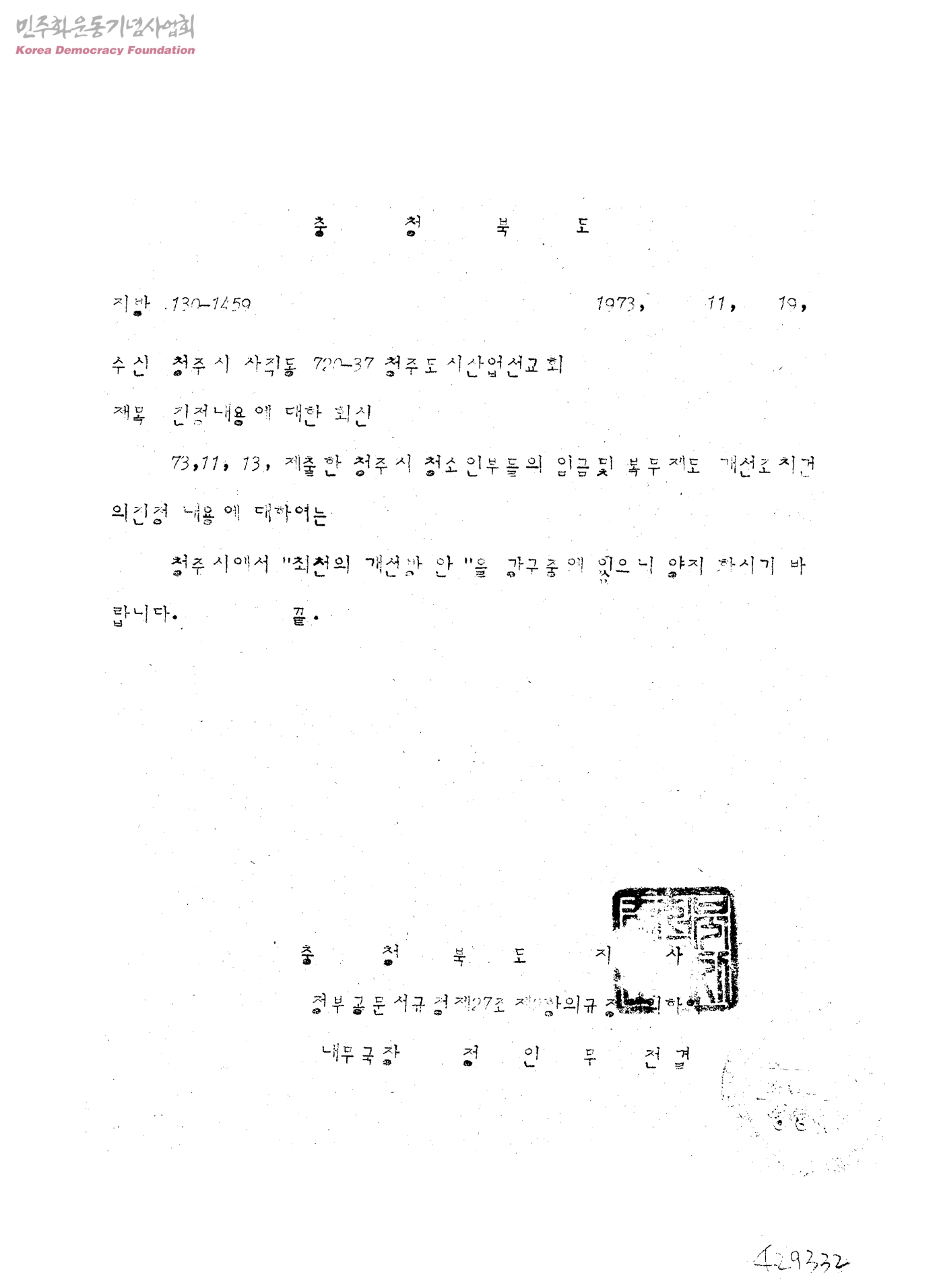 [청주시청 청소부 근로개선문제 관련자료]진정내용에 대한 회신[청주시 청소인부들의 임금및 복무제도 개선조치건 관련][수신:청주도시산업선교회,발신:충청북도지사]