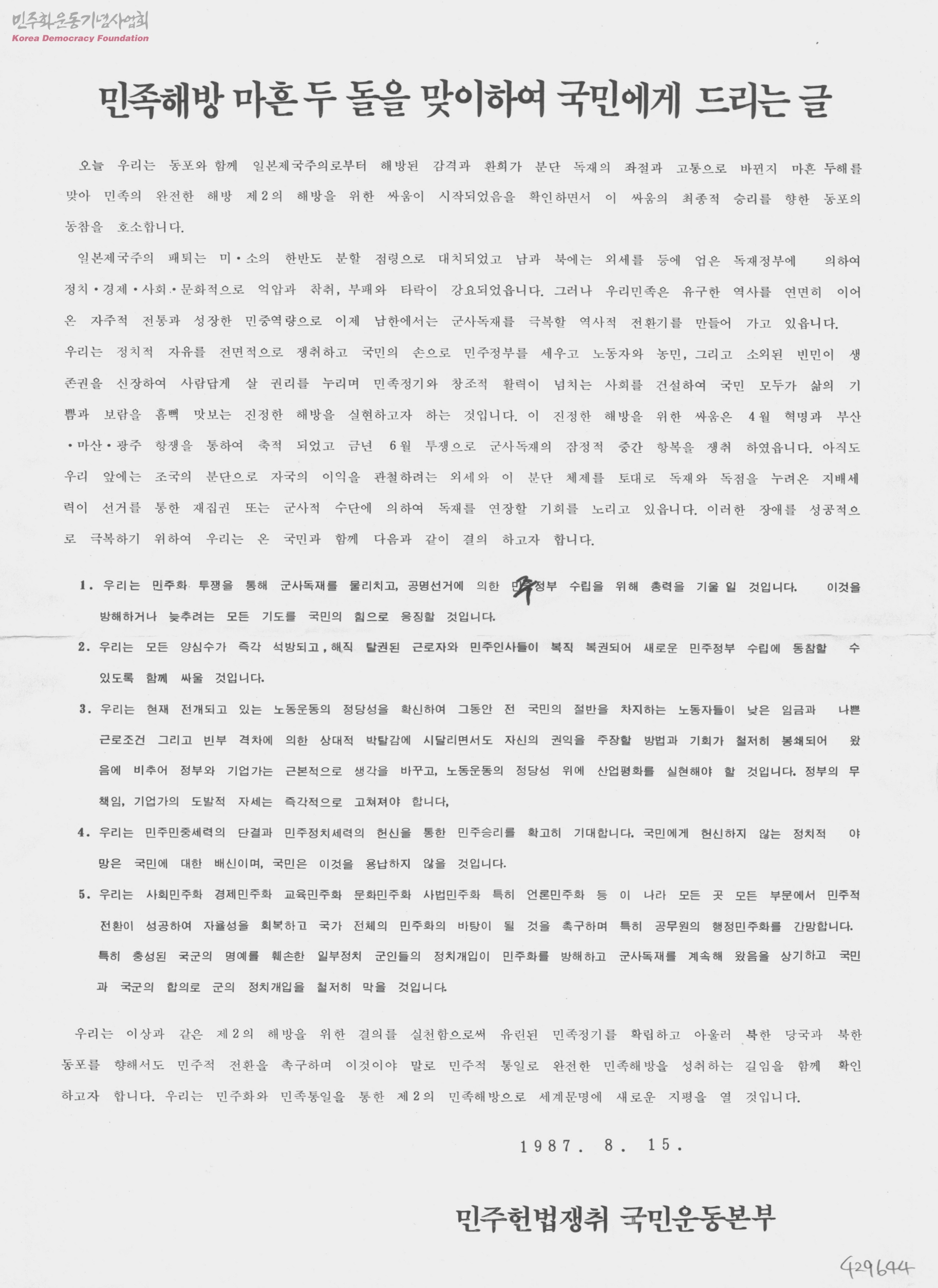 민족해방 마흔 두 돌을 맞이하여 국민에게 드리는 글[인쇄본]