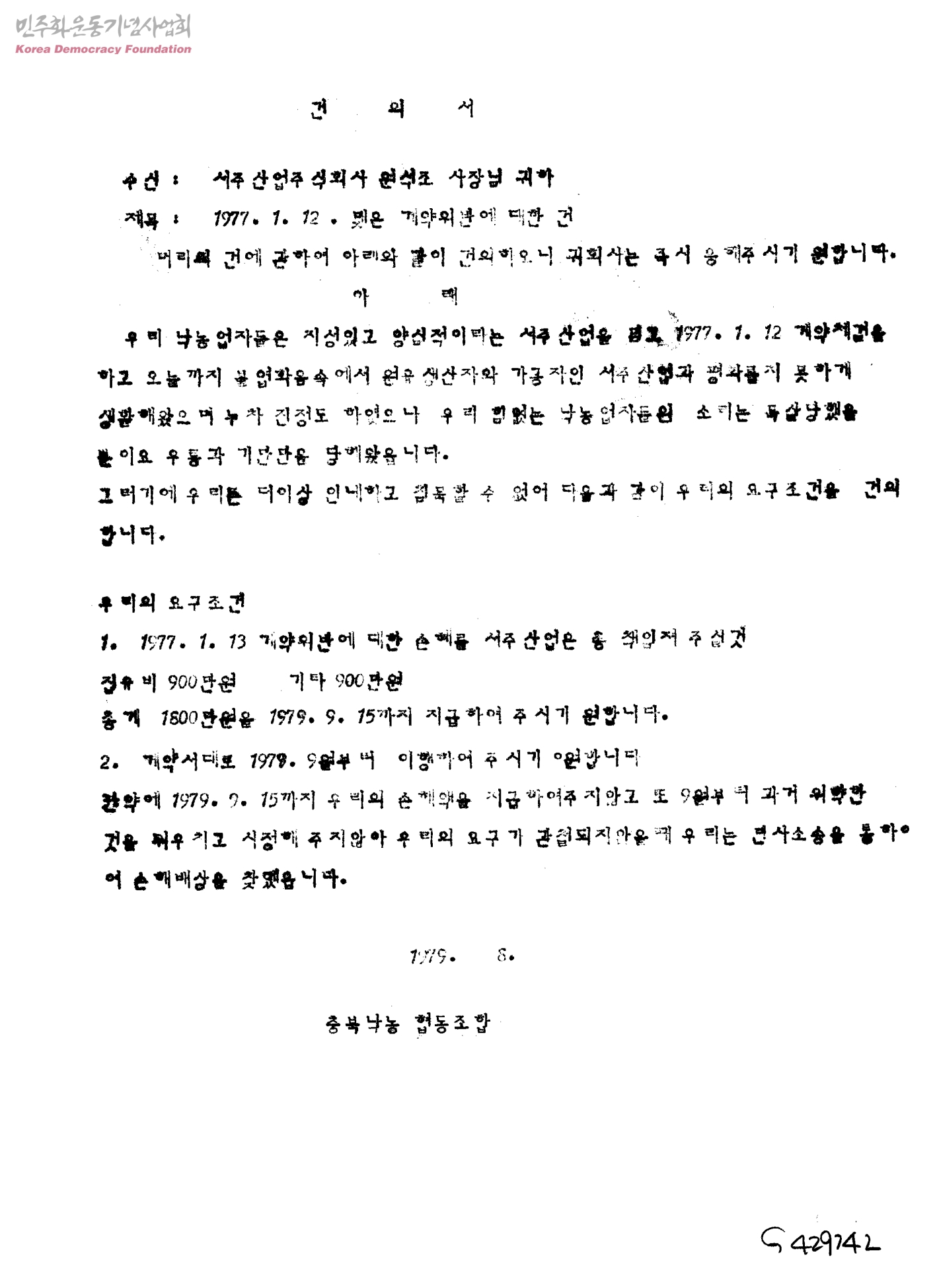 [서주산업과 충북낙농협동조합 원유매매 계약 관련자료]건의서-1977.1.12 맺은 계약위반에 대한 건[수신:사주산업,발신:충북낙농협동조합]
