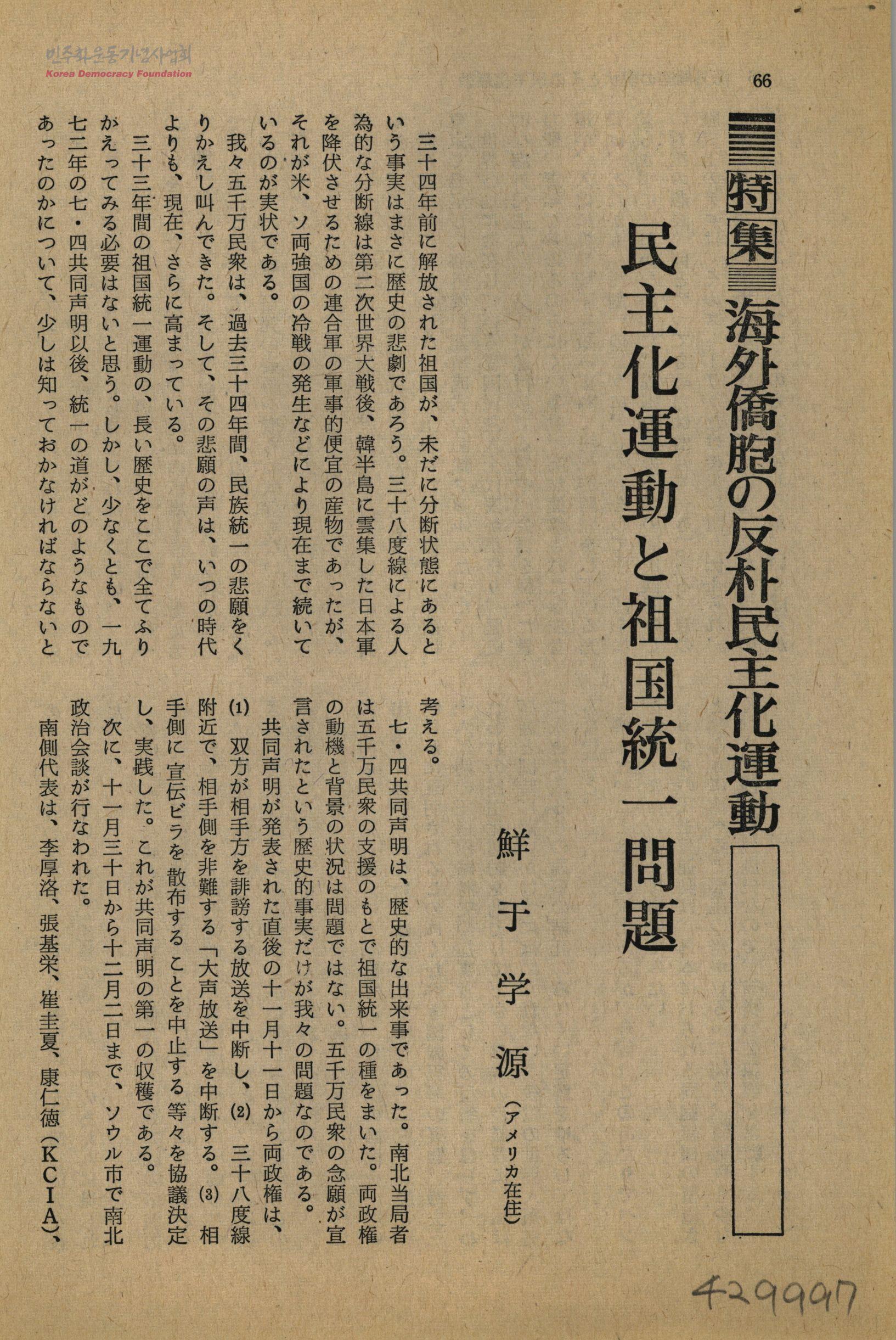 特集 海外僑胞の反朴民主化運動 民主化運動と祖國統一問題