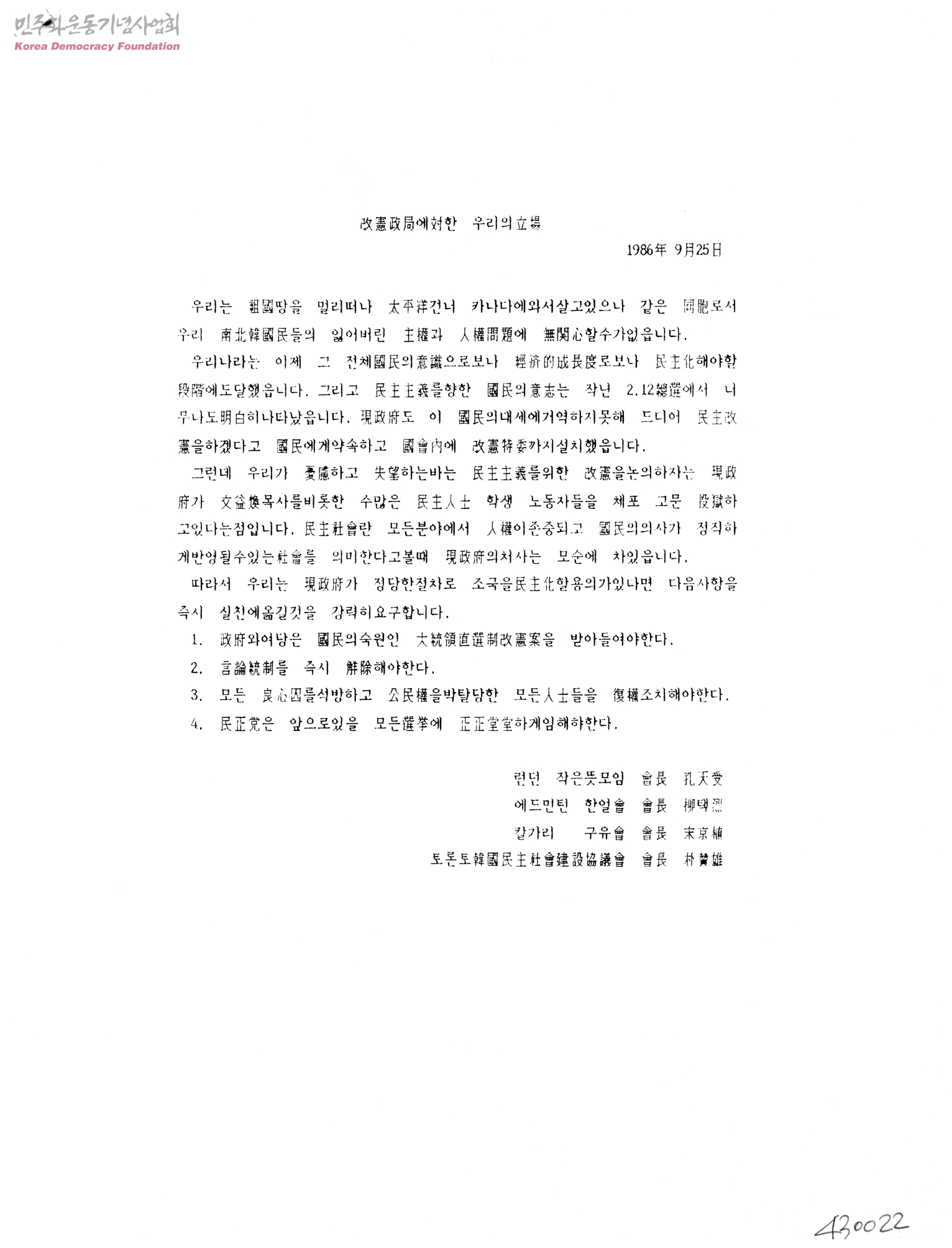 - 런던작은뜻모임,에드먼턴한얼회,칼가리구유회,토론토한국민주사회건설협의회