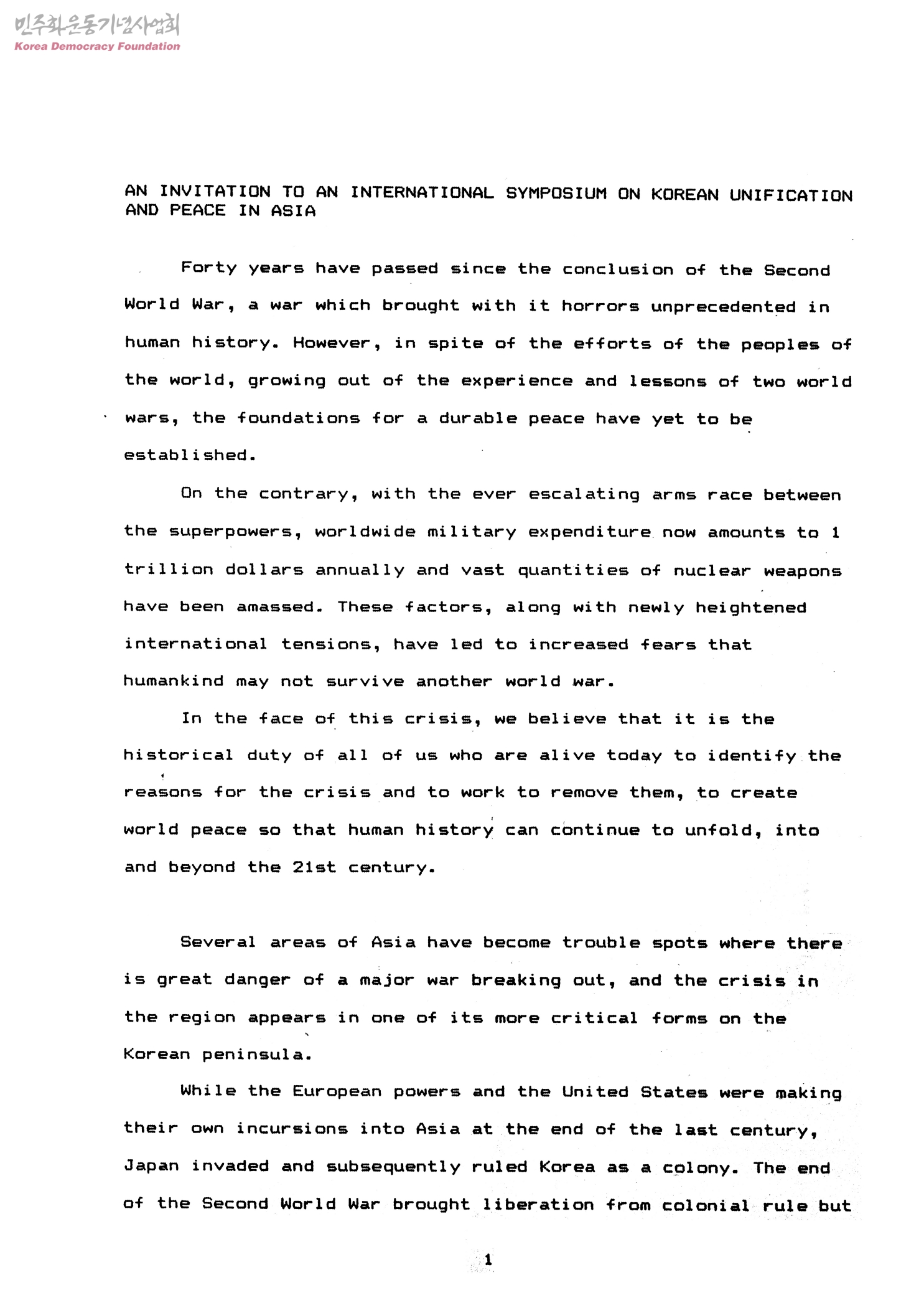 AN INVITATION TO AN INTERNATIONAL SYMPOSIUM ON KOREAN UNIFICATION AND PEACE IN ASIA