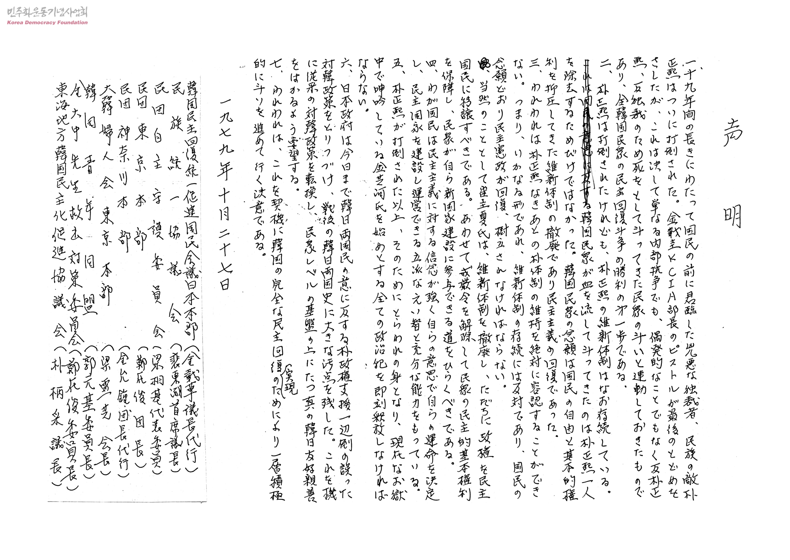 - 한국민주회복통일촉진국민회의일본본부,민족통일협의회,민단자주수호위원회,민단신내천본부,대한부인회동경본부,한국청년연맹,김대중선생구출대책위원회,동해지방한국민주화협의회