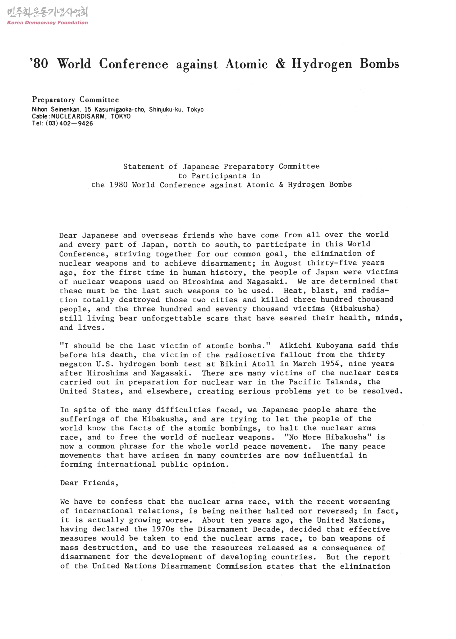 Statement of Japanese Preparatory Committee to Participants in the 1980 World Conference against Atomic & Hydrogen Bombs