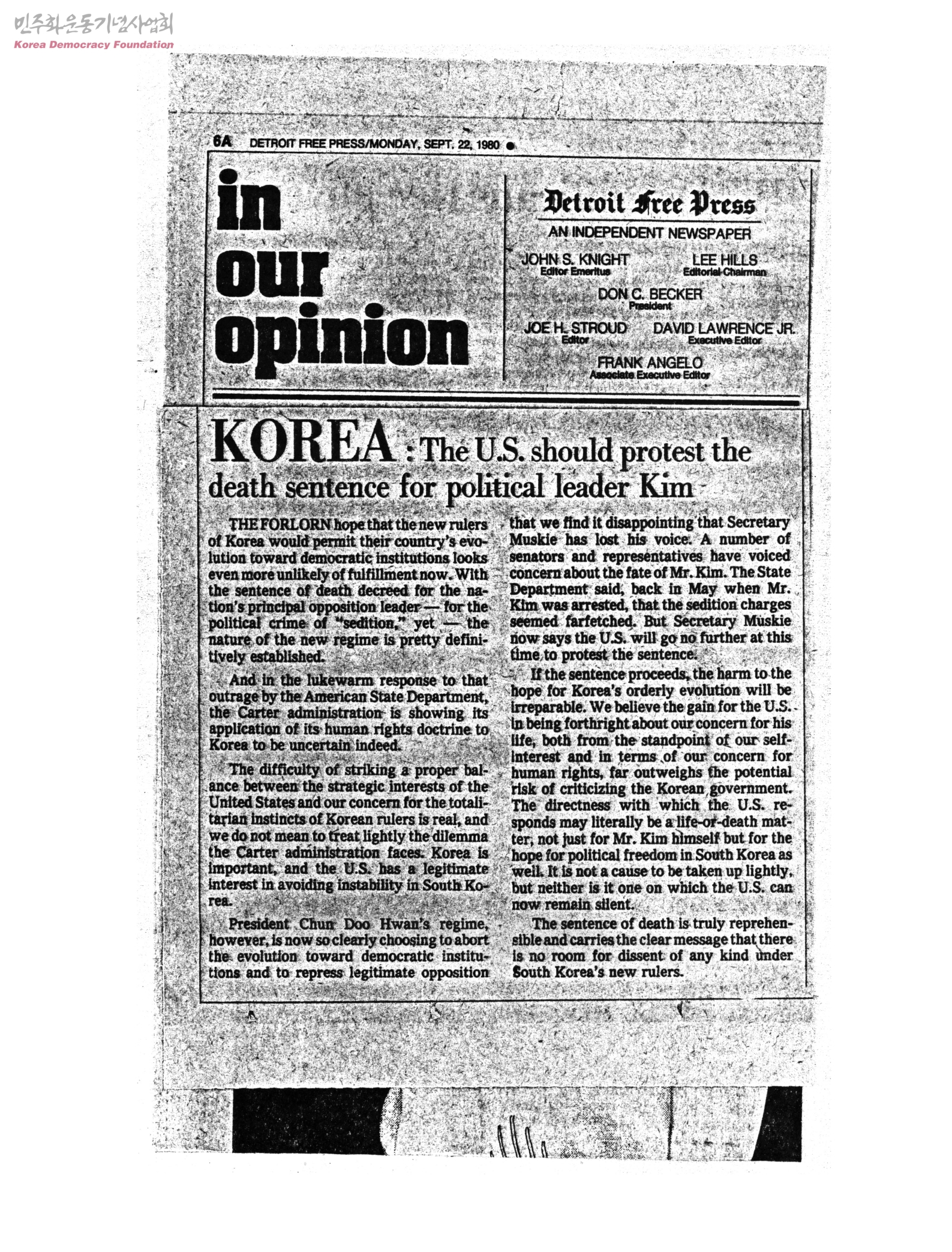 [신문스크랩]KOREA : The U.S. should protest the death sentence for political leader Kim관련기사