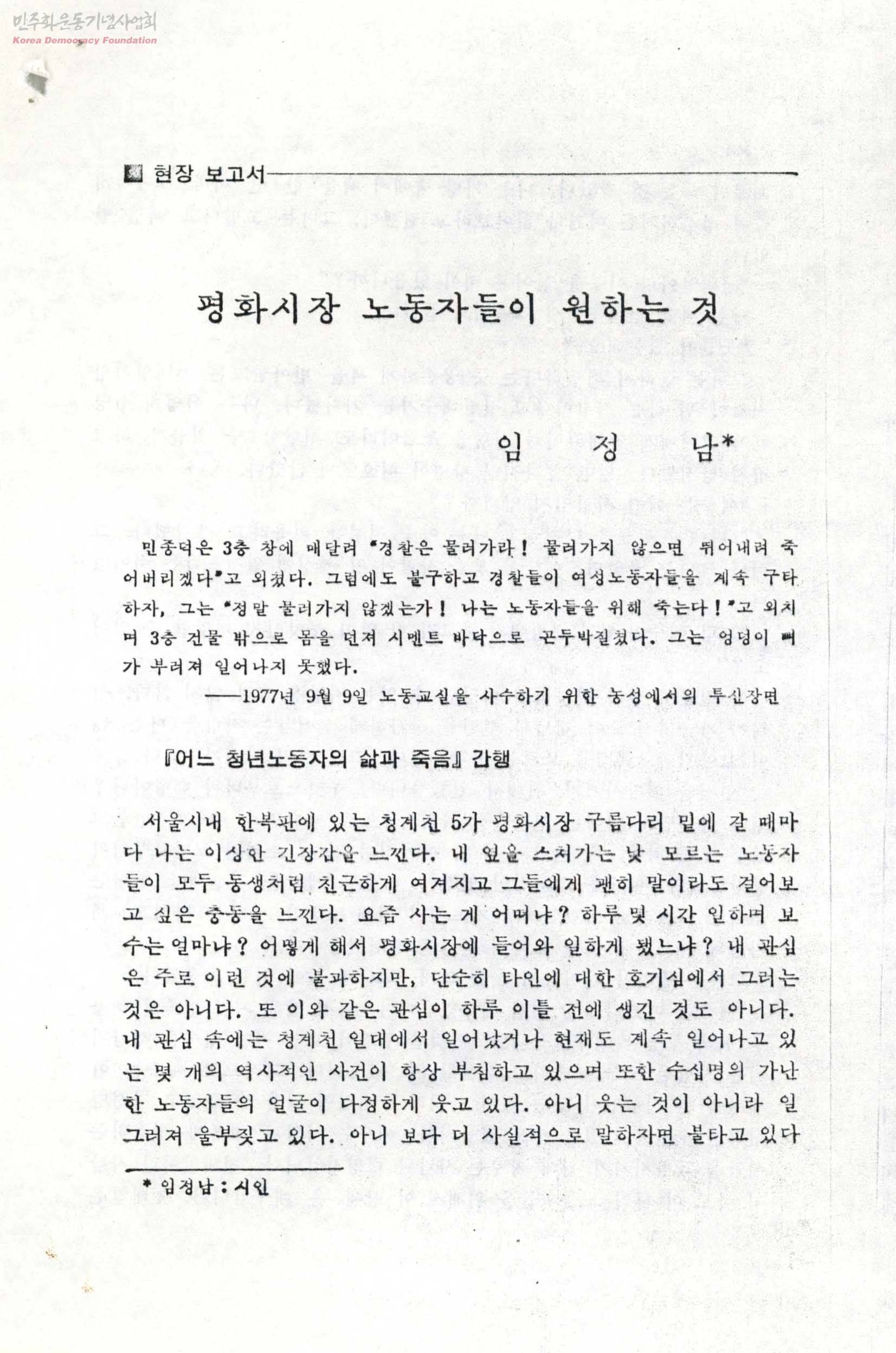 - 임정남 시인이 직접 겪은 평화시장 노동자들의 인간적인 삶을 위한 투쟁이야기를 대화와 설명의 형식으로 쓴 글.