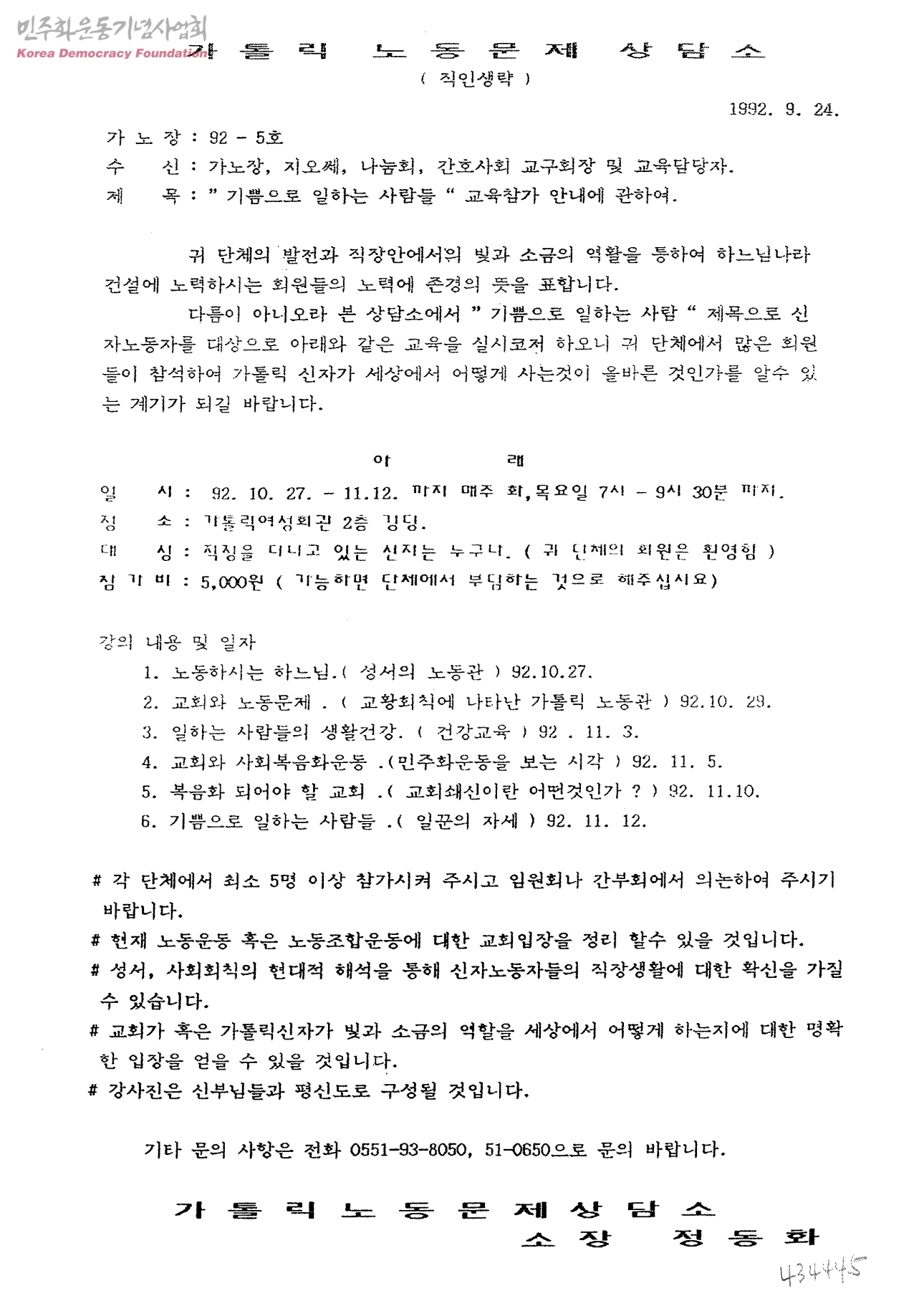기쁨으로 일하는 사람들 교육참가 안내에 관하여[수신:가노장, 지오쎄, 나눔회, 간호사회 교구회장 및 교육담당자, 발신:가톨릭노동문제상담소]