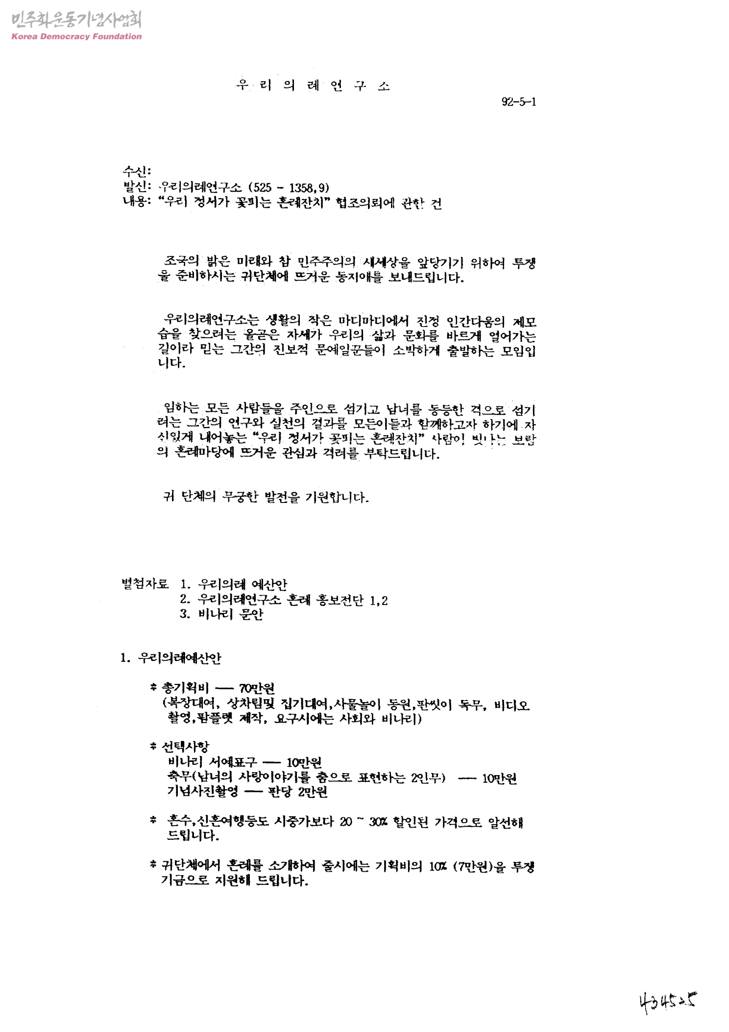 우리 정서가 꽃피는 혼례잔치 협조의뢰에 관한 건[수신:[가톨릭노동사목전국협의회], 발신:우리의례연구소]