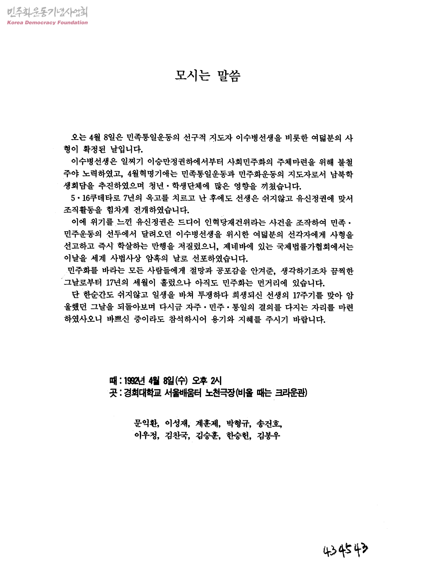 [모시는 말씀-이수병선생 사형 확정 17주기 행사 안내문]