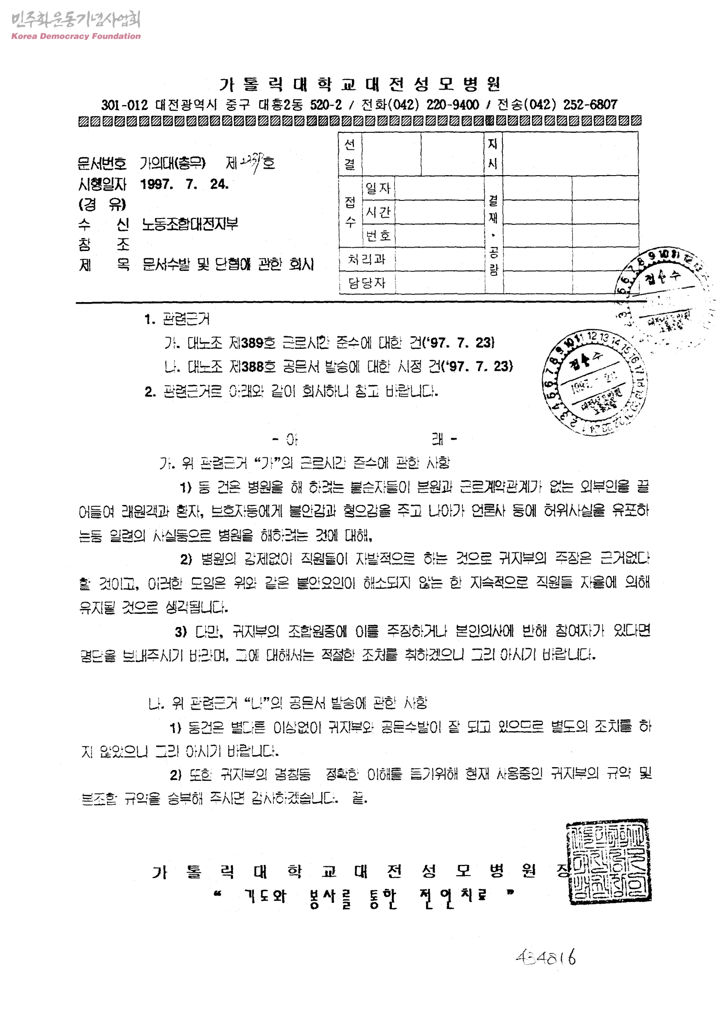 문서수발 및 단협에 관한 회시[수신:노동조합대전지부, 발신:가톨릭대학교 대전성모병원]