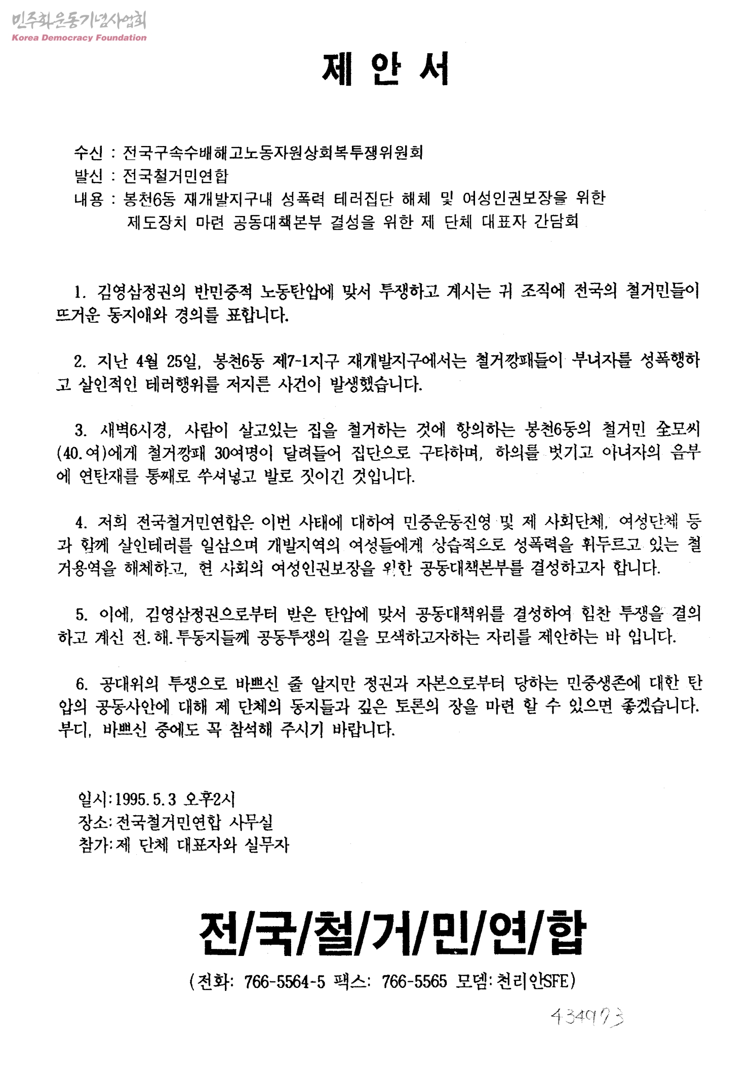 제안서-봉천6동 재개발지구내 성폭력 테러집단 해체 및 여성인권보장을 위한 제도장치 마련 공동대책본부 결성을 위한 제 단체 대표자 간담회[수신:전국구속수배해고노동자원상회복투쟁위원회, 발신:전국철거민연합]