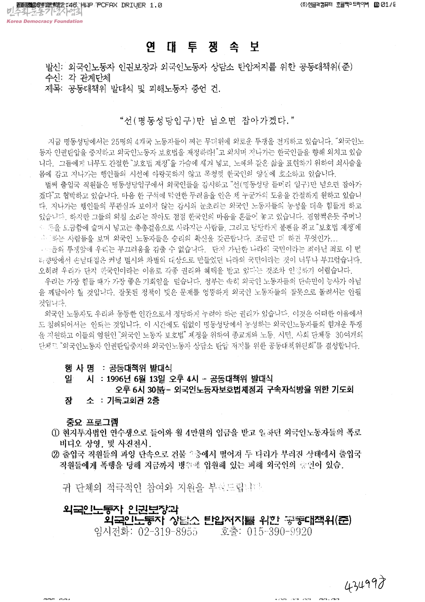 연대투쟁속보[수신:각 관계단체, 발신:외국인노동자 인권보장과 외국인노동자 상담소 탄압저지를 위한 공동대책위(준)]