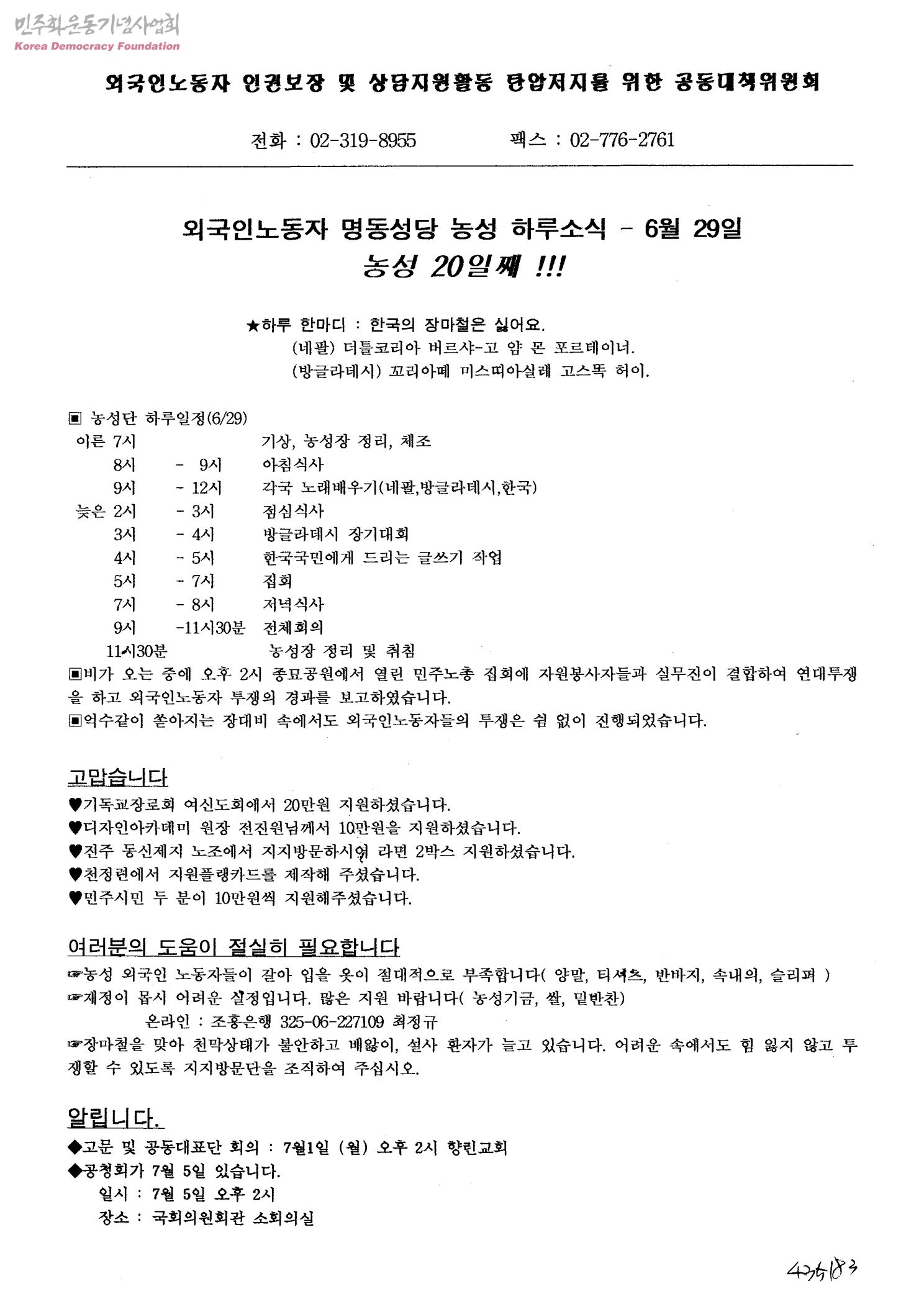 외국인노동자 명동성당 농성 하루소식 - 6월 29일