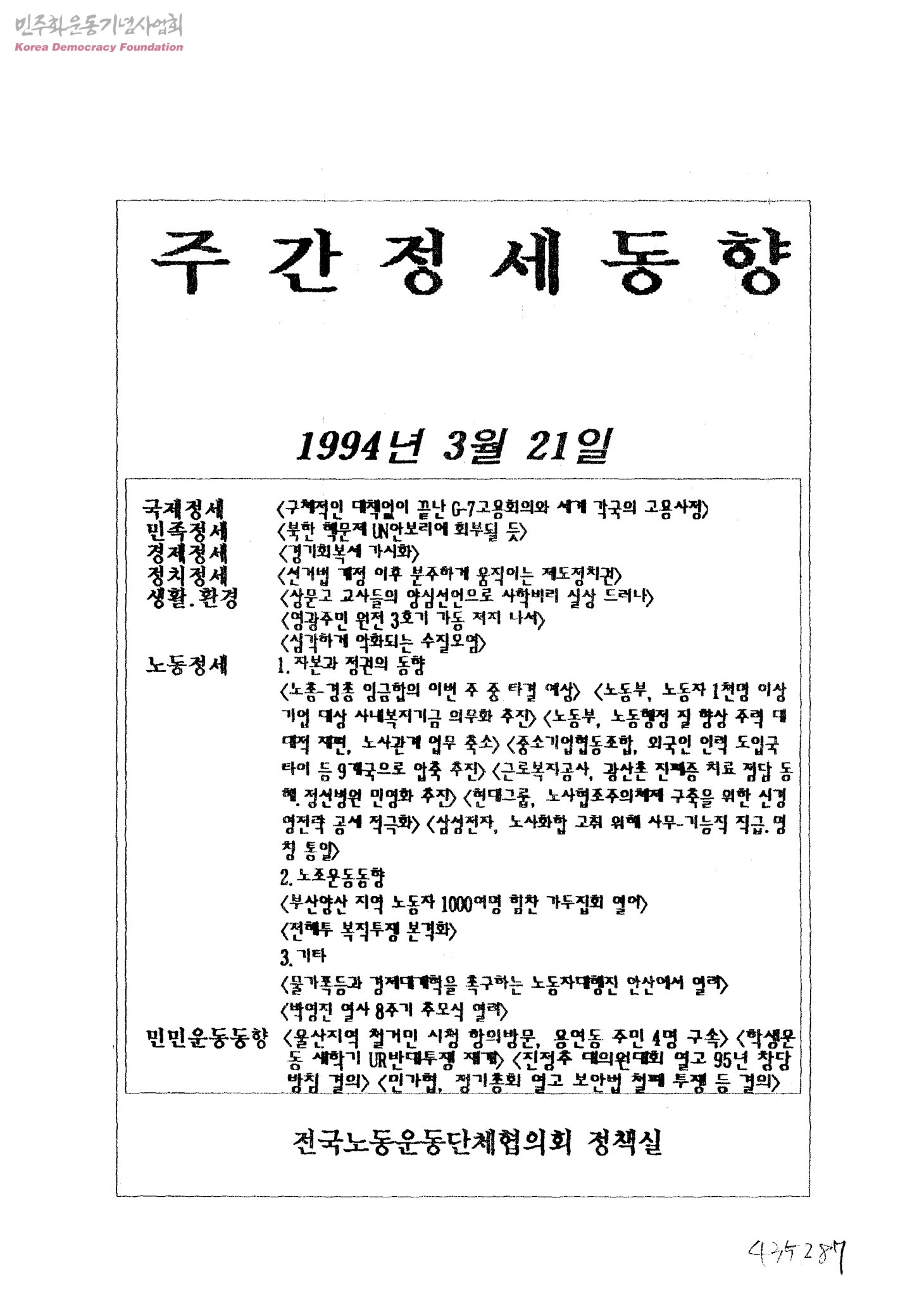 - 국제, 민족, 경제, 정치, 생활·환경, 노동정세, 민민운동동향