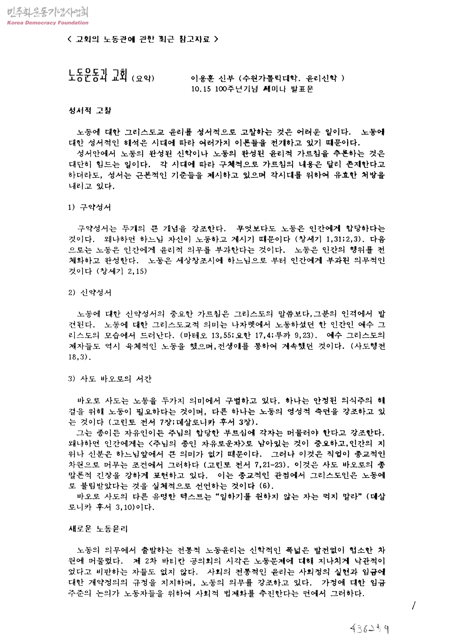 <교회의 노동관에 관한 최근 참고자료>[노동운동과 교회(요약), 한국 가톨릭 교회의 사회 참여(요약)]