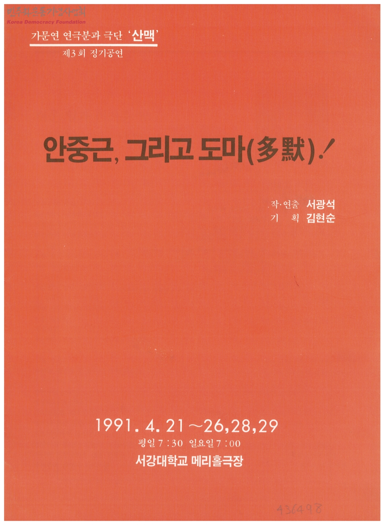 가문연 연극분과 극단 '산맥' 제 3회 정기공연 안중근, 그리고 도마(多默)