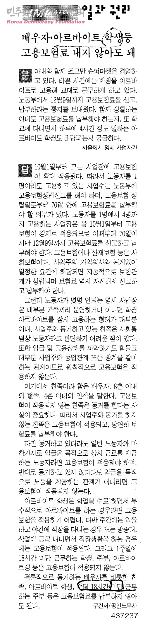 [신문스크랩] IMF시대 일과 권리-배우자·아르바이트 학생등 고용보험료 내지 않아도 돼