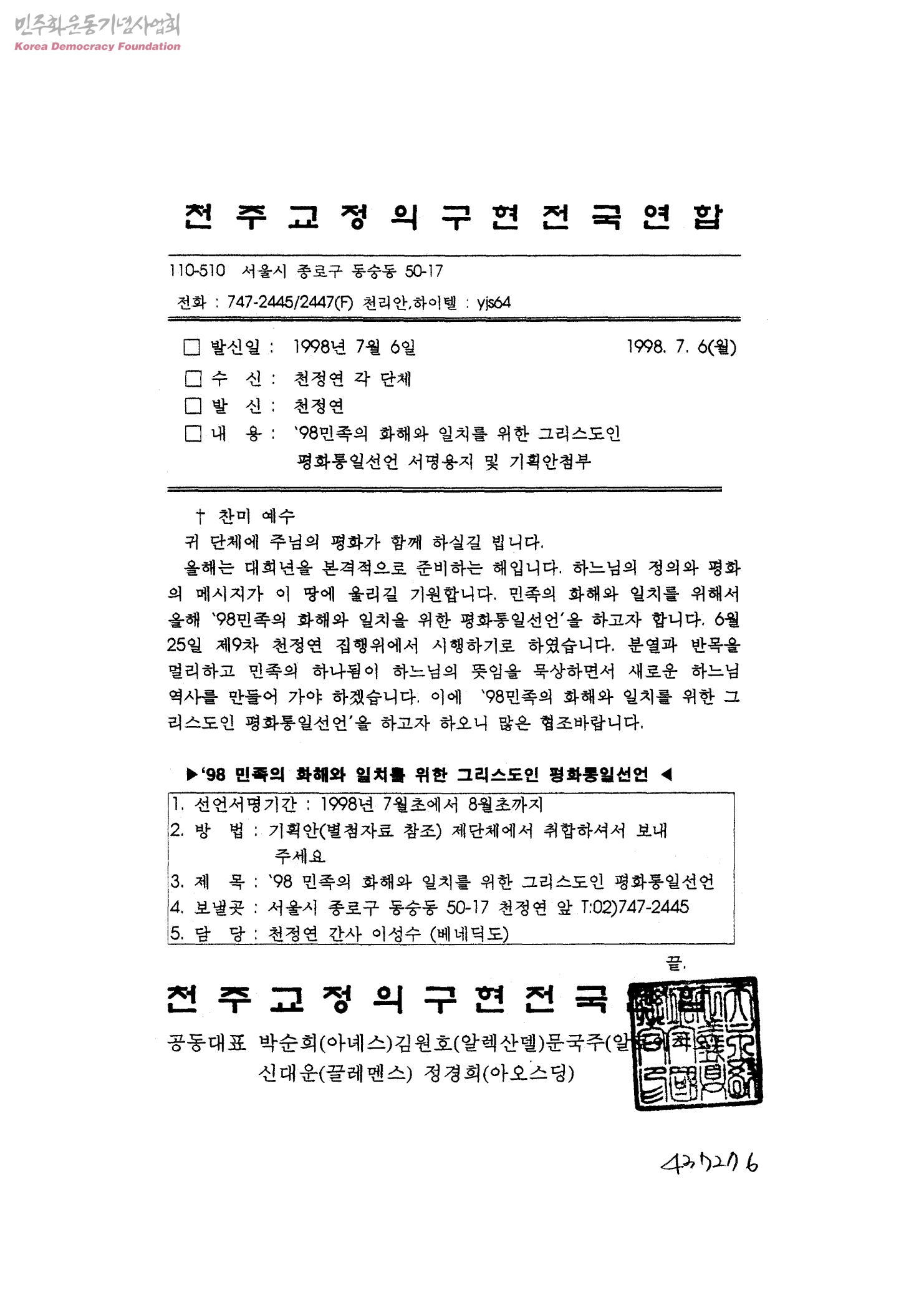 '98민족의 화해와 일치를 위한 그리스도인 평화통일선언 서명용지 및 기획안첨부[수신:천정연 각 단체,발신:천정연]
