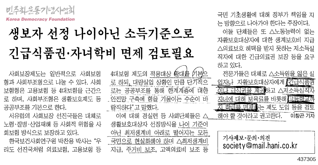 [신문스크랩] 생보자 선정 나이아닌 소득기준으로 긴급식품권·자녀학비 면제 검토필요