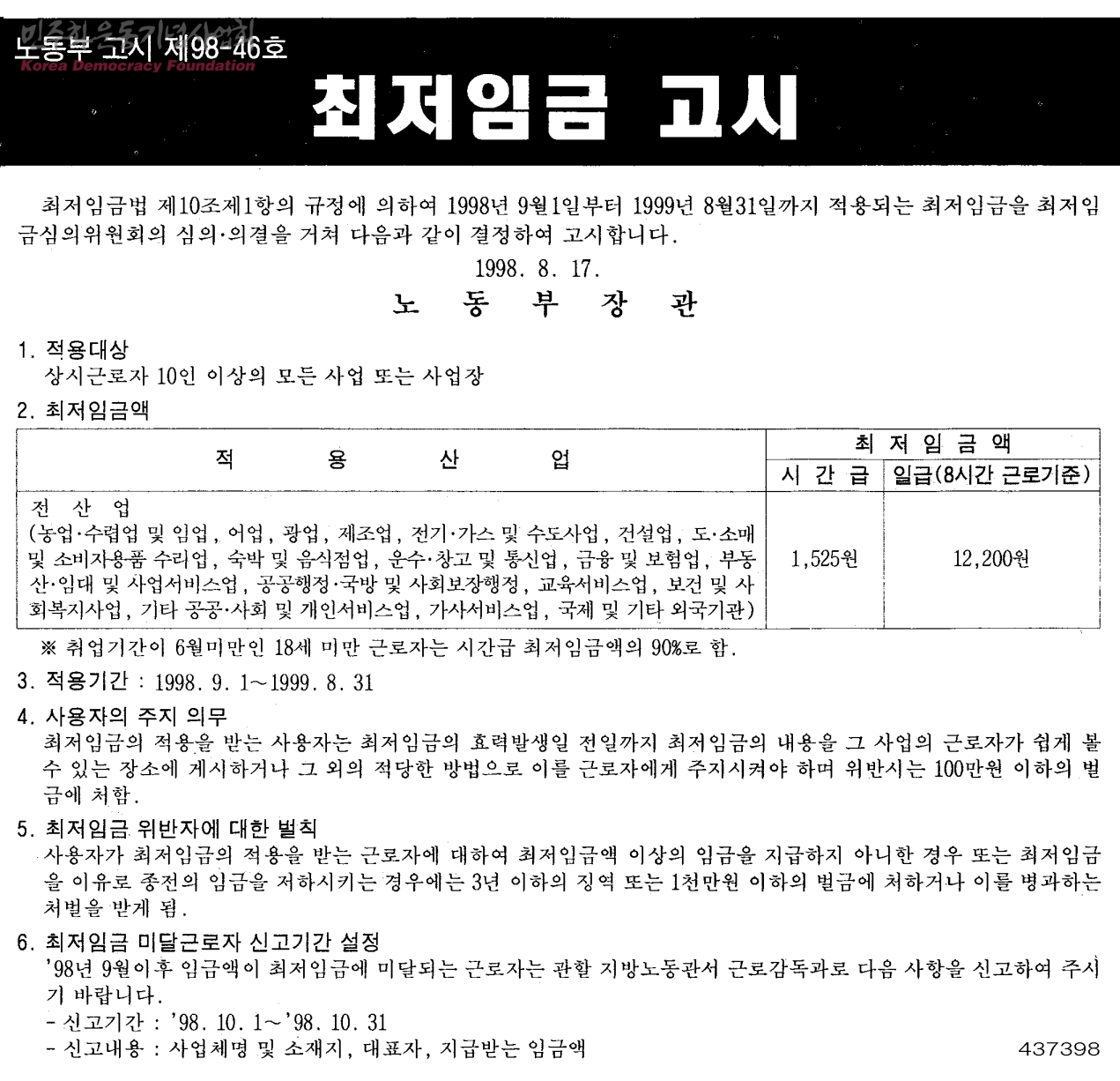 [신문스크랩] 노동부 고시 제98-46호 최저임금 고시