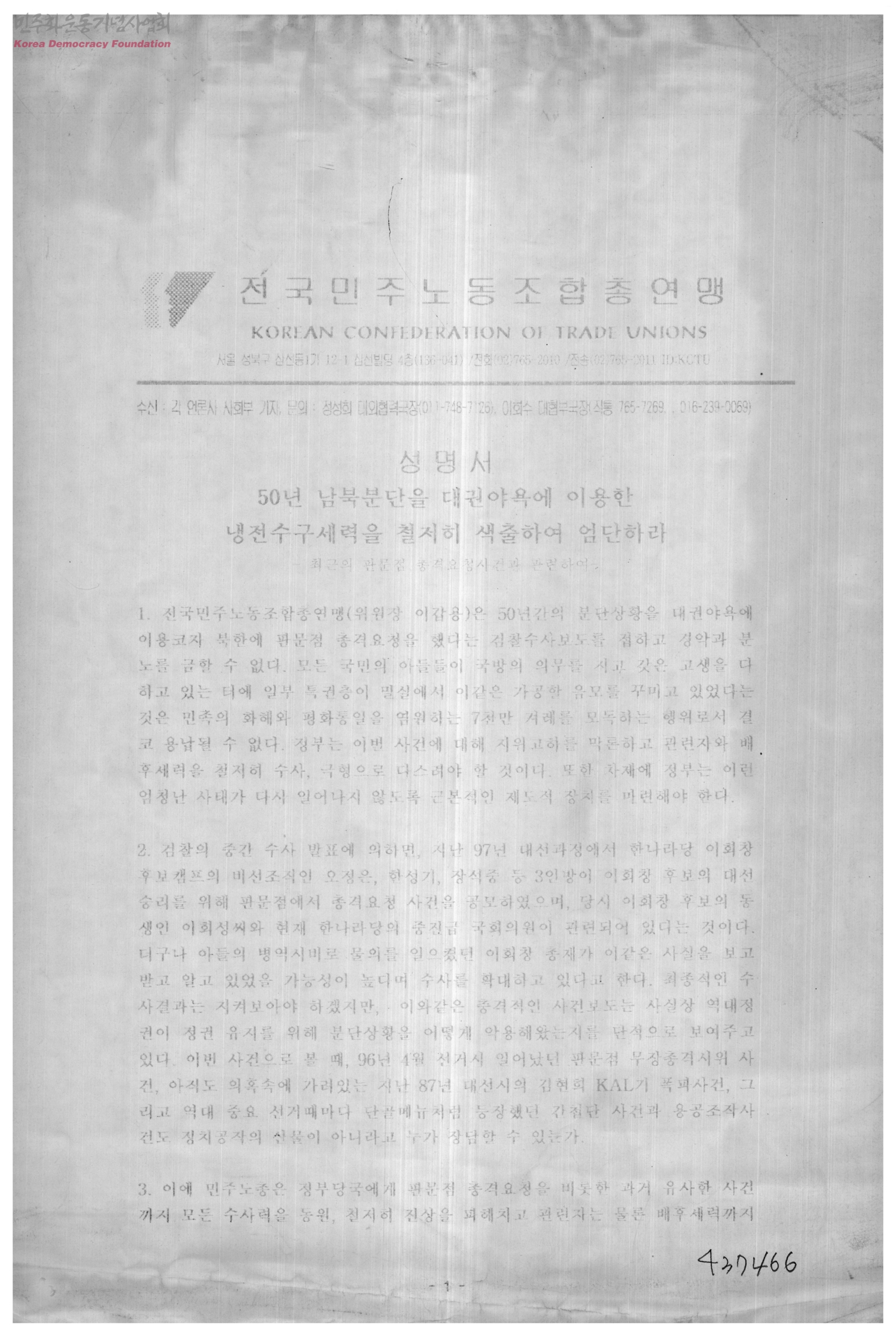 성명서-50년 남북분단을 대권야욕에 이용한 냉전수구세력을 철저히 색출하여 엄단하라[수신:각 언론사 사회부 기자]