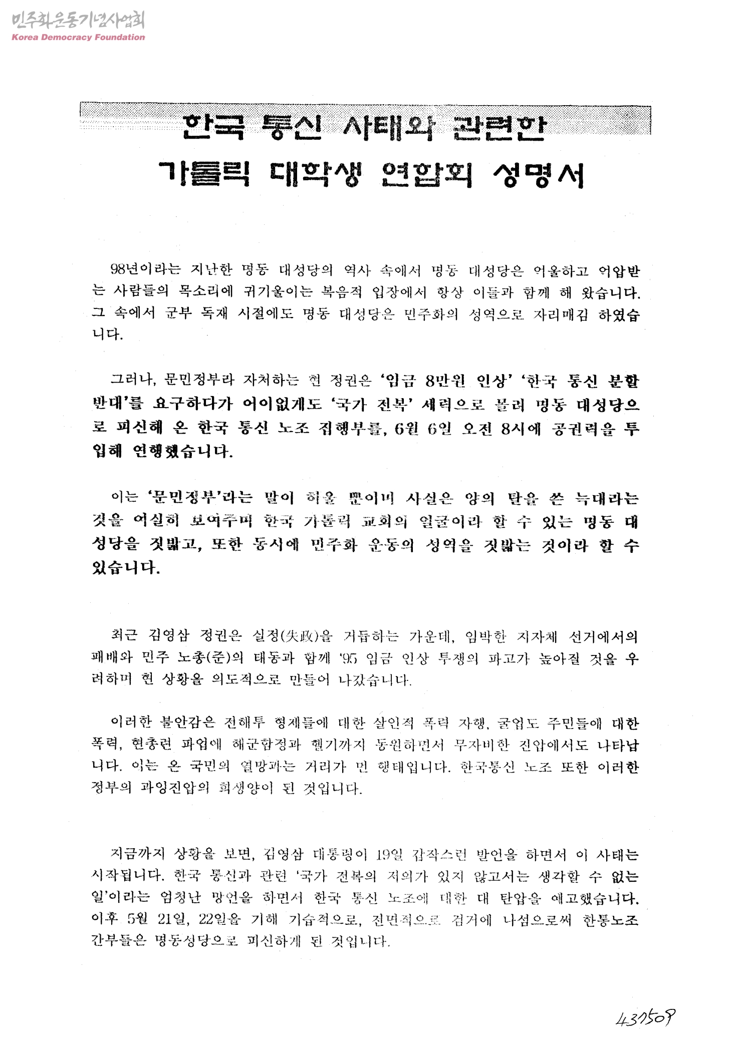 한국 통신 사태와 관련한 가톨릭 대학생 연합회 성명서
