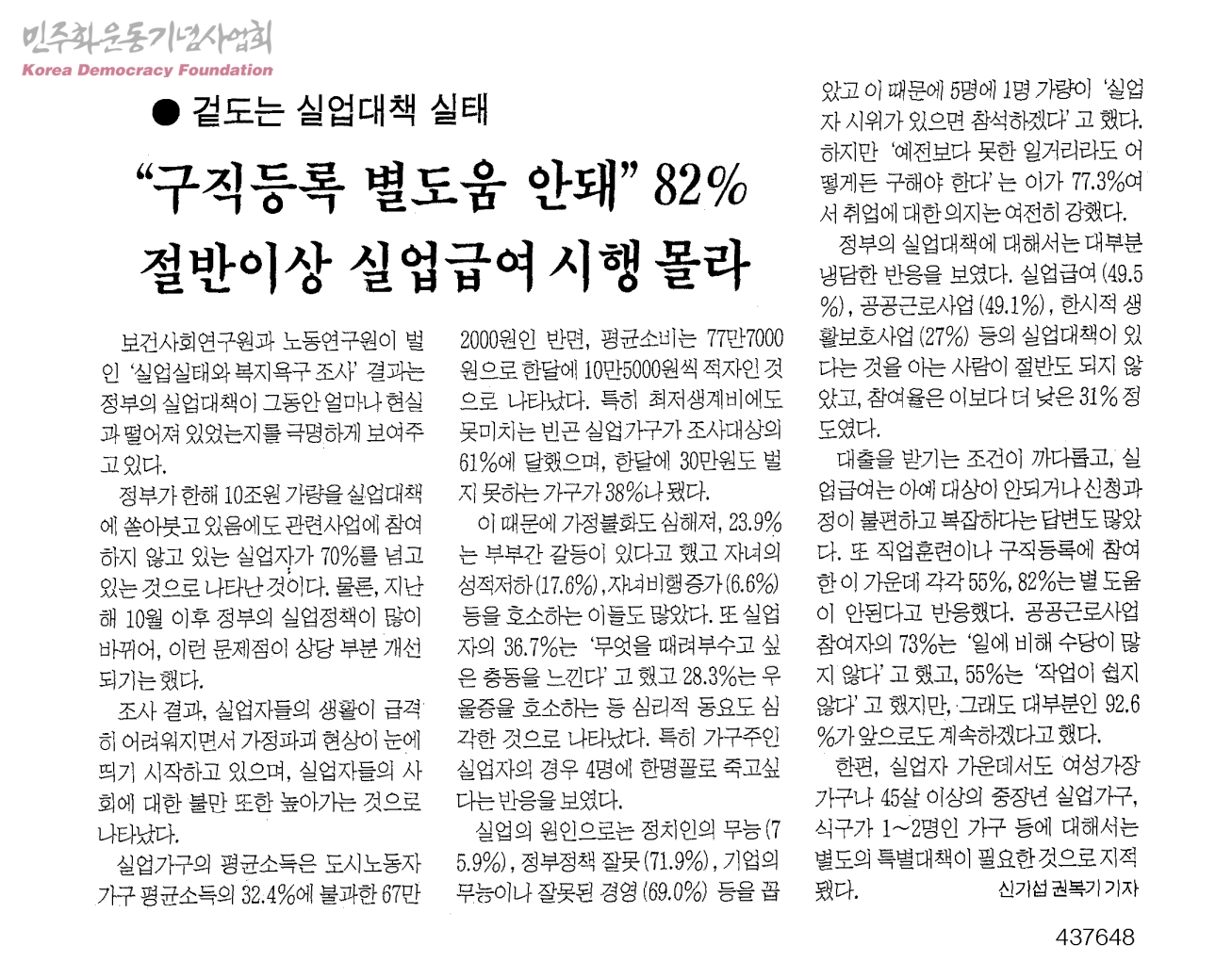 [신문스크랩] 겉도는 실업대책 실태 "구직등록 별도움 안돼" 82% 절반이상 실업급여 시행 몰라
