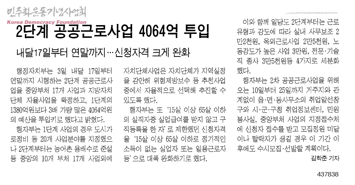 [신문스크랩] 2단계 공공근로사업 4064억 투입