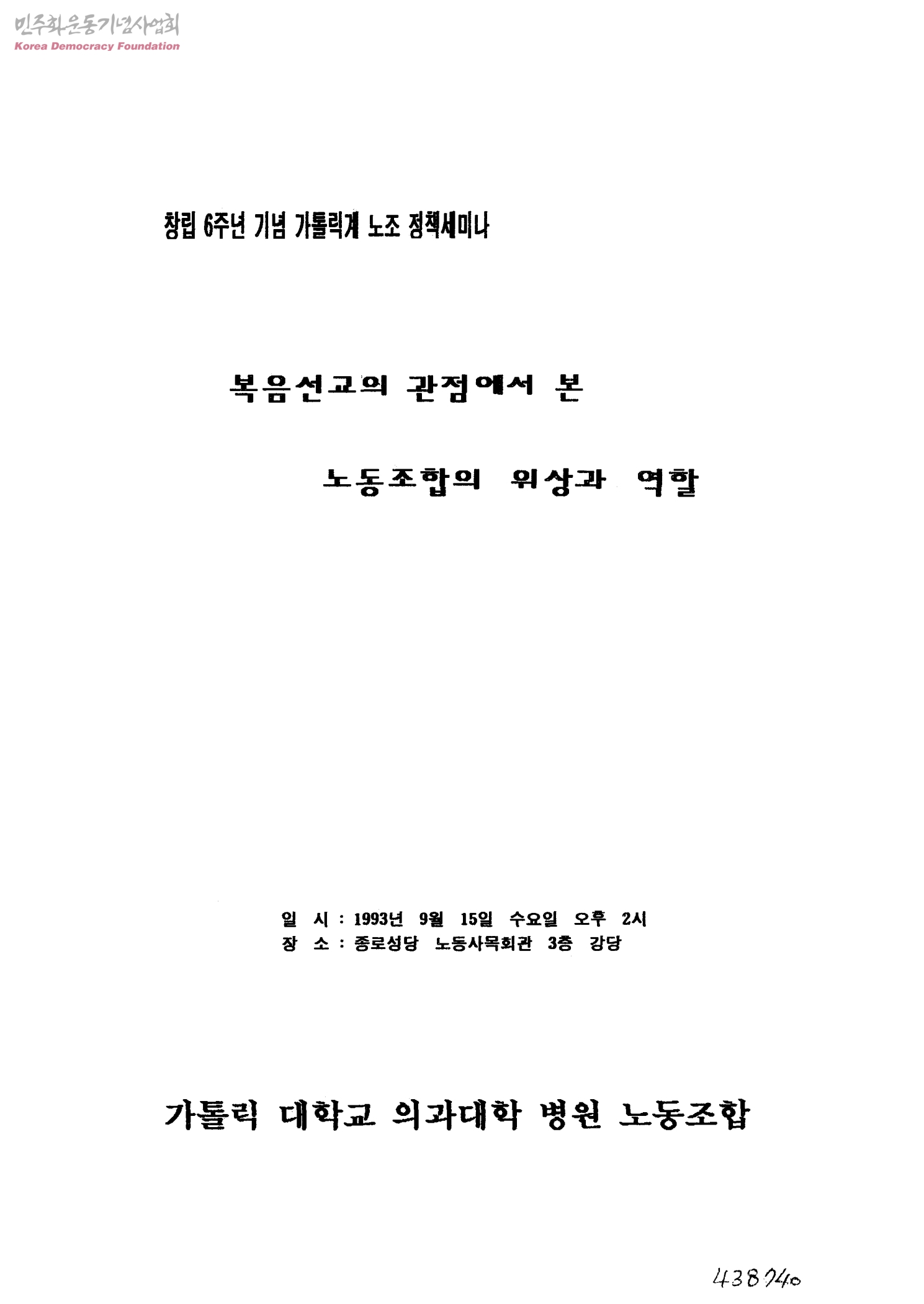 창립 6주년 기념 가톨릭계 노조 정책세미나 복음선교의 관점에서 본 노동조합의 위상과 역할