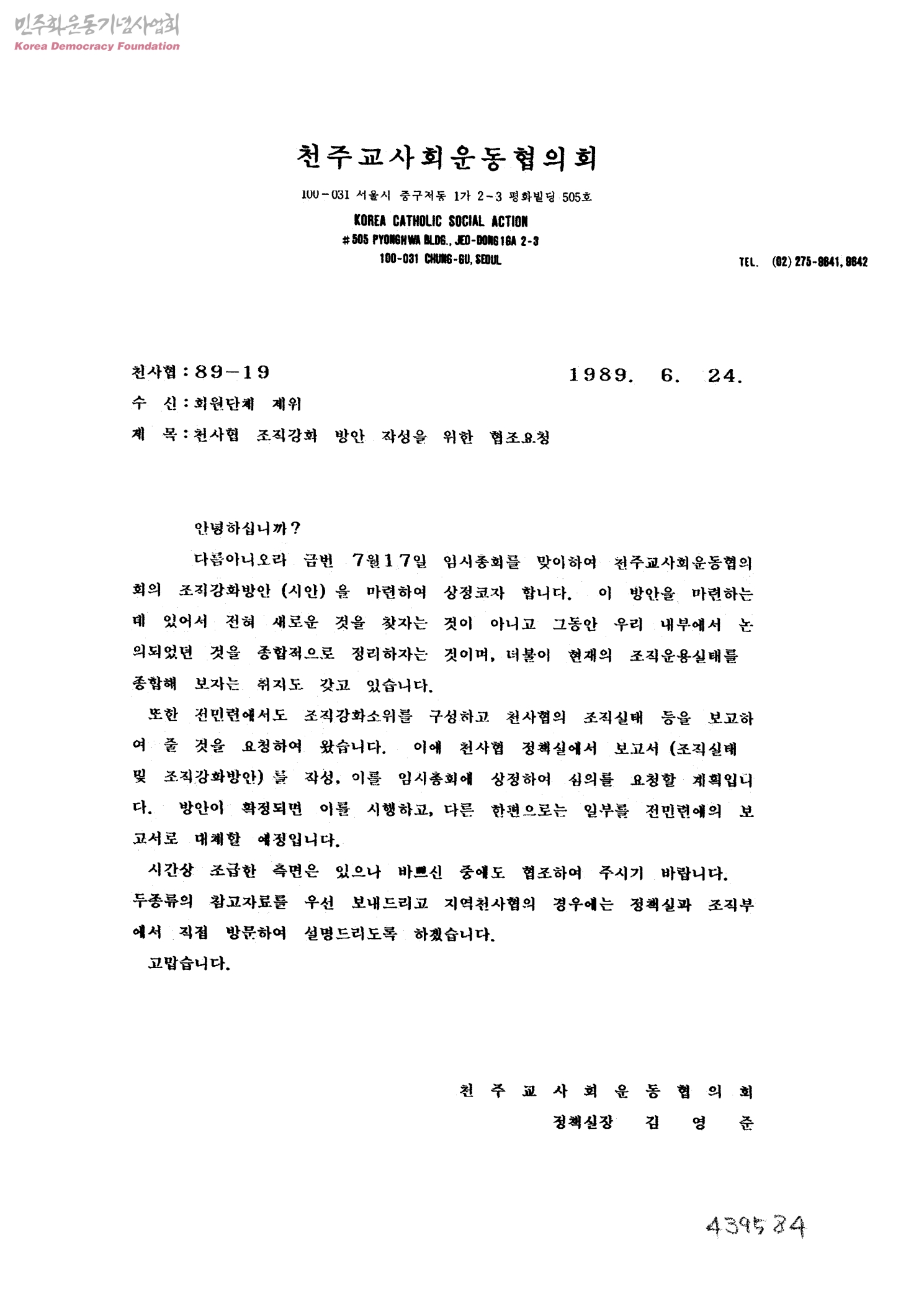 천사협 조직강화 방안 작성을 위한 협조요청[수신:회원단체 제위, 발신: 천주교사회운동협의회 정책실장 김영준]