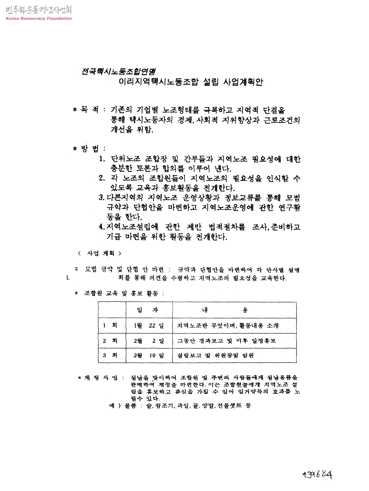 전국택시노동조합연맹 이리지역택시노동조합 설립 사업계획안