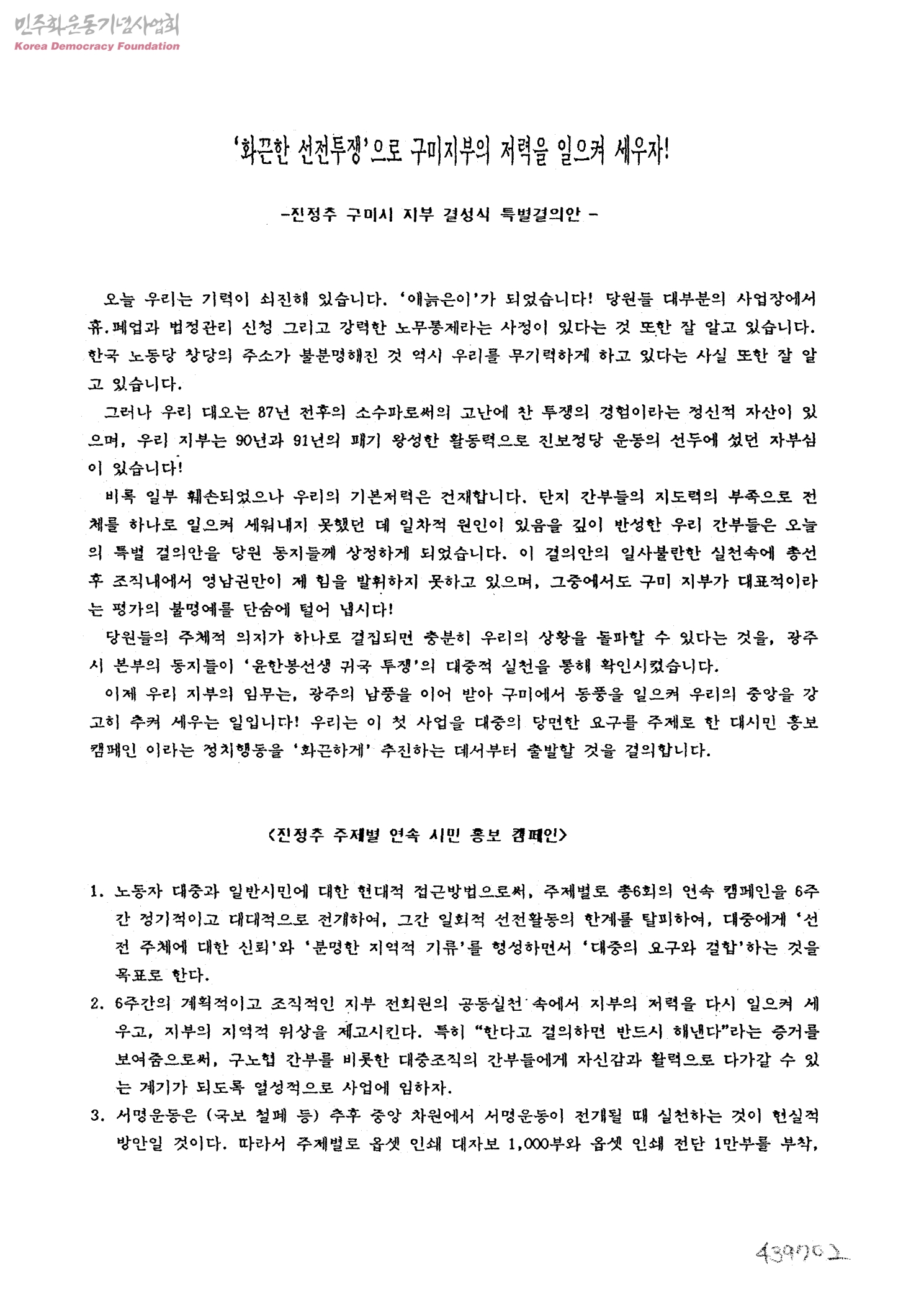 '화끈한 선전투쟁'으로 구미지부의 저력을 일으켜 세우자! - 진정추 구미시 지부 결성식 특별결의안