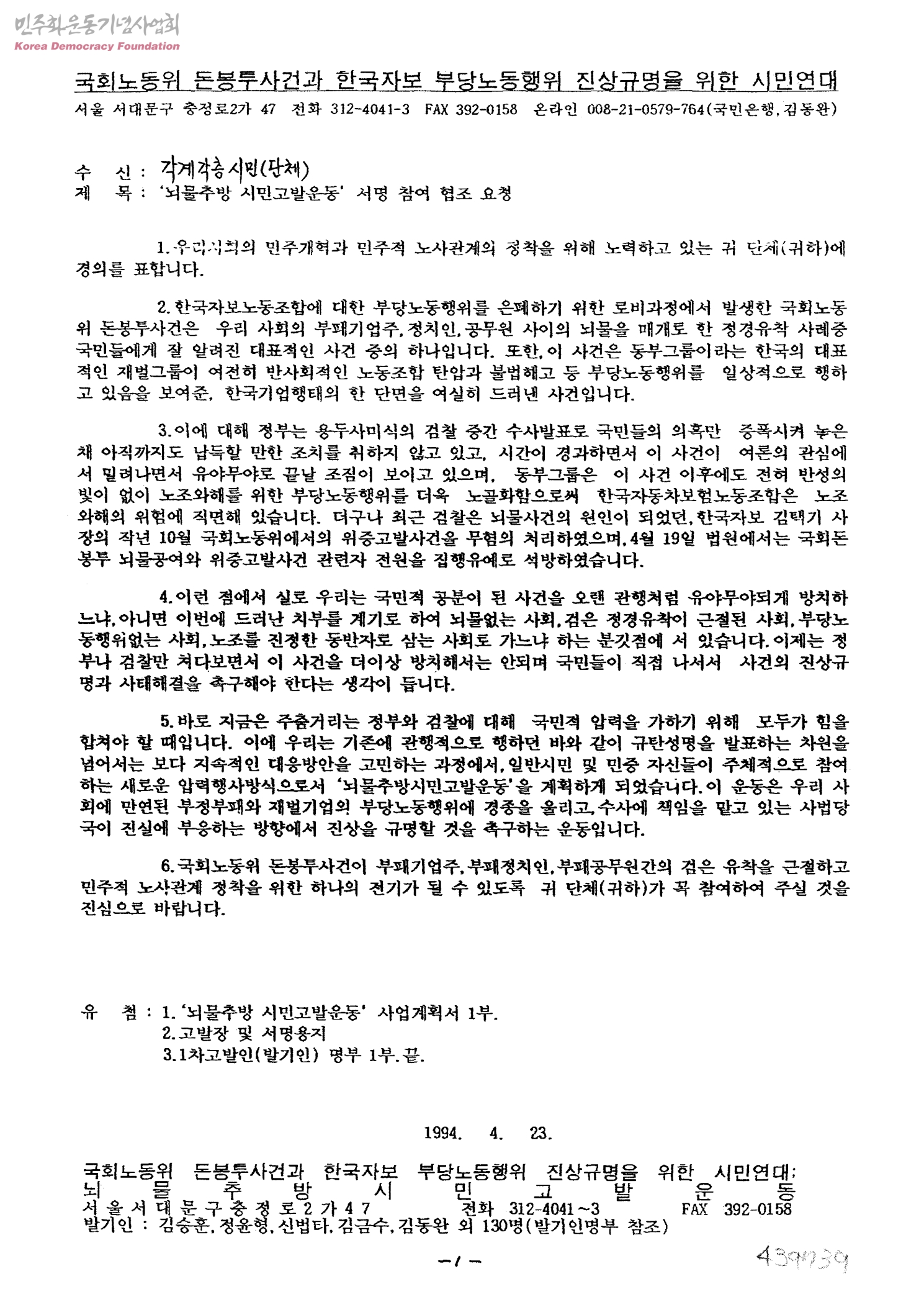 - 국회노동위돈봉투사건과한국자보부당노동행위진상규명을위한시민연대