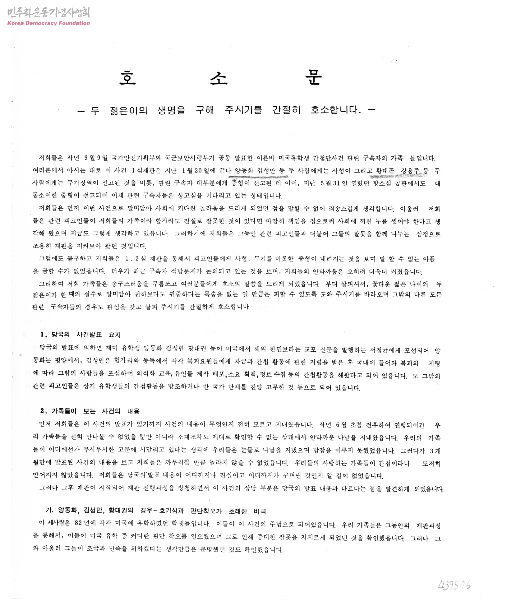- 미국유학생 간첩단 사건의 요지와 선처를 바라는 가족들의 호소문