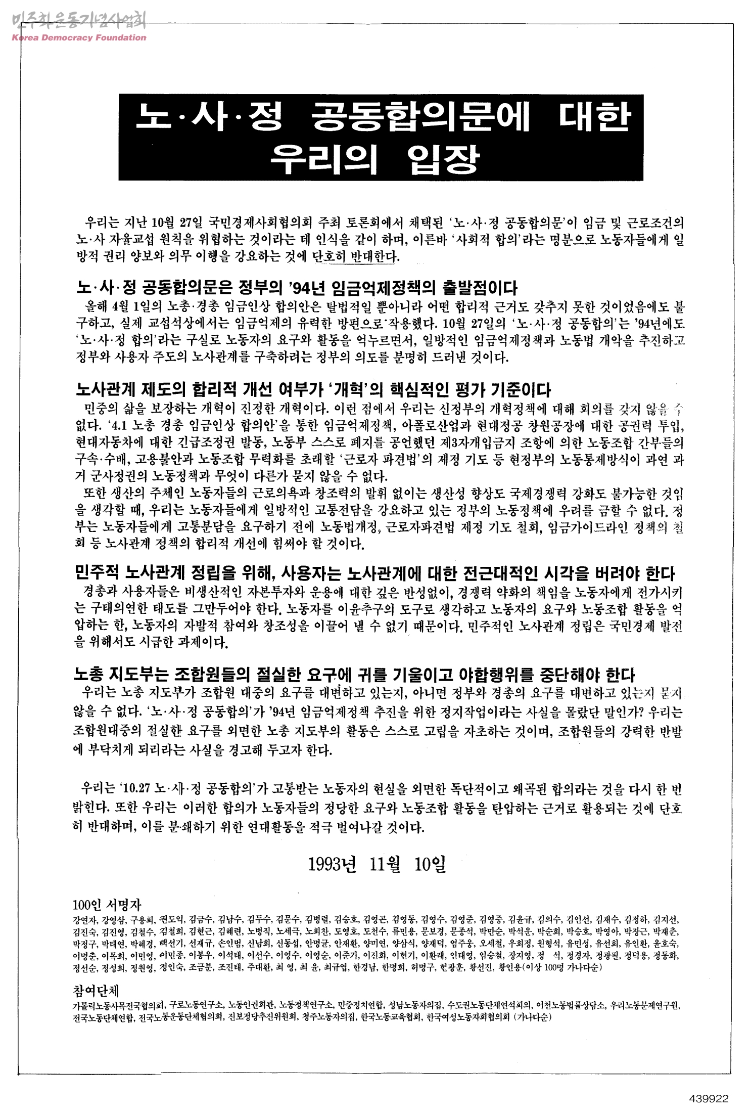 - 가톨릭노동사목전국협의회,구로노동연구소,노동인권회관,노동정책연구소,민중정치연합,성남노동자의집,수도권노동단체연석회의,이천노동법률상담소,우리노동문제연구원,전국노동단체연합,전국노동운동단체협의회,진보정당추진위원회,청주노동자의집,한국노동교육협회,한국여성노동자회협의회