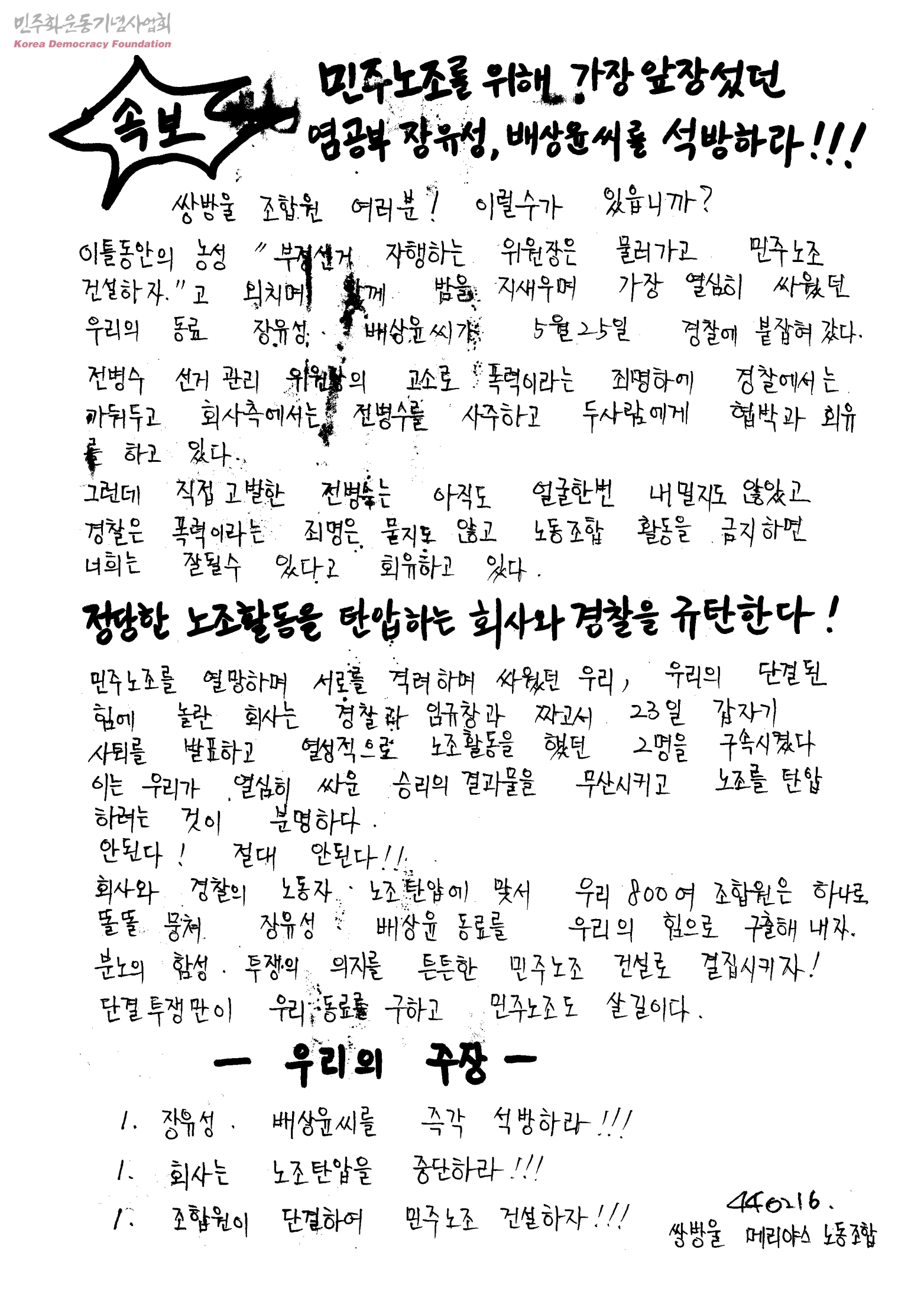 민주노조를 위해 가장 앞장섰던 염공부 장유성, 배상윤씨를 석방하라!!!