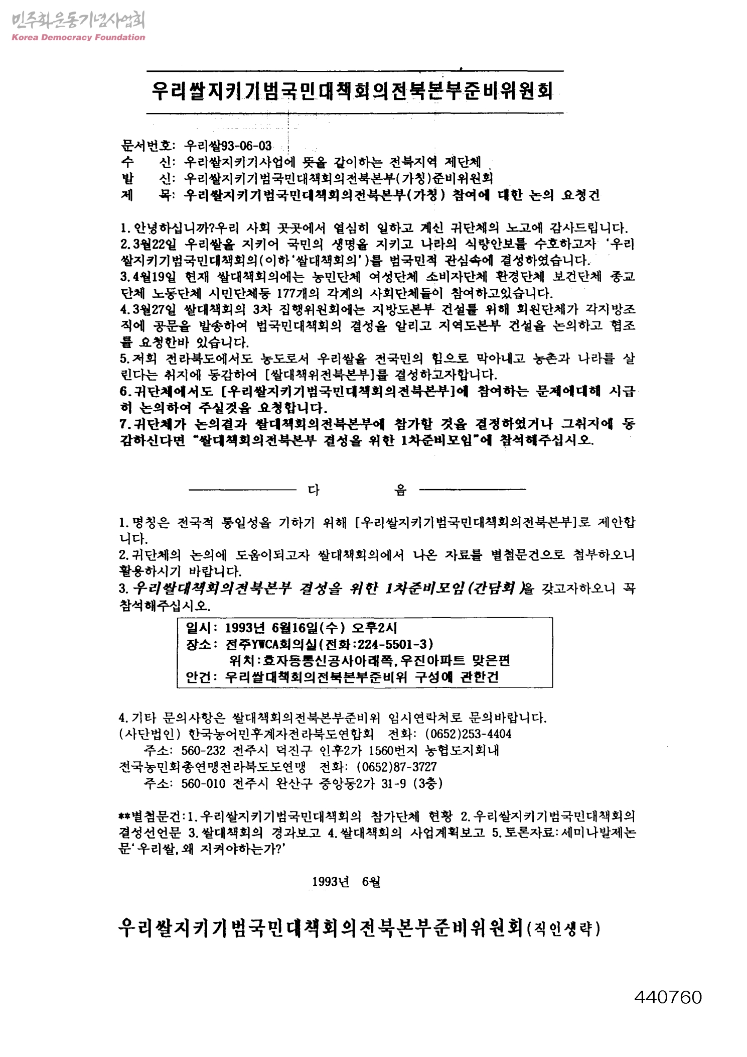 우리쌀지키기범국민대책회의전북본부(가칭) 참여에 대한 논의 요청건[수신:우리쌀지키기사업에 뜻을 같이하는 전북지역 제단체, 발신:우리쌀지키기범국민대책회의전북본부(가칭)준비위원회