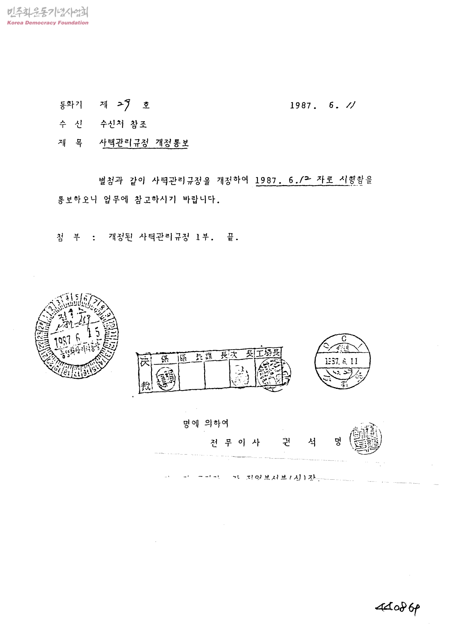 사택관리규정 개정통보