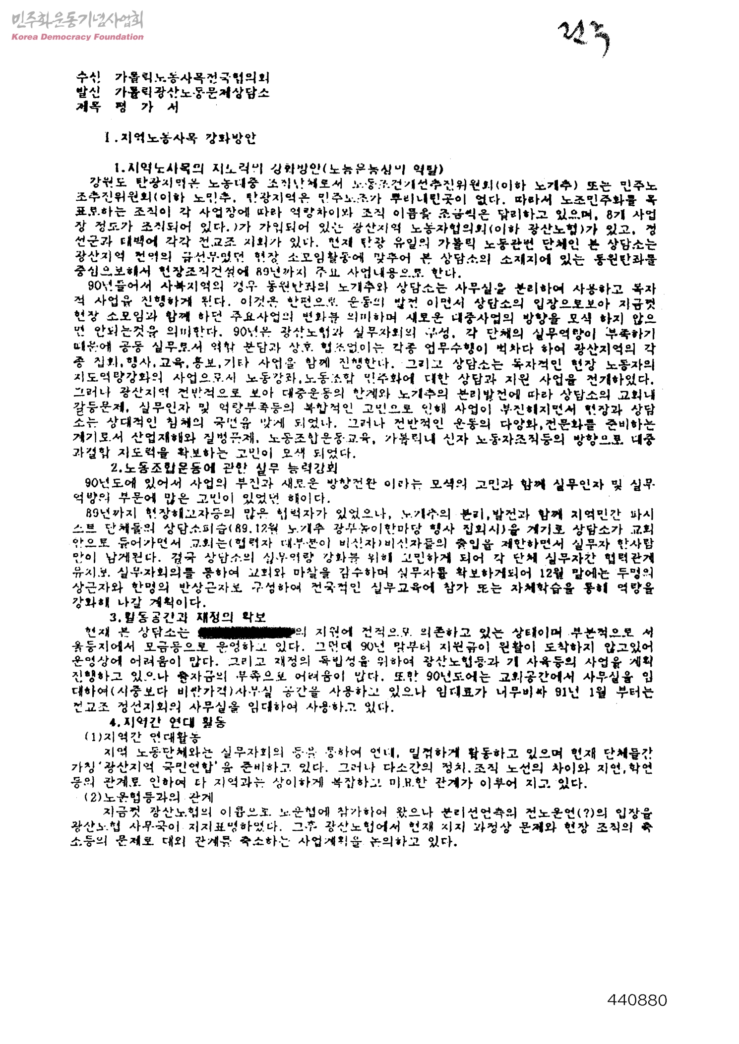 평가서[수신:가톨릭노동사목전국협의회, 발신:가톨릭광산노동문제상담소]