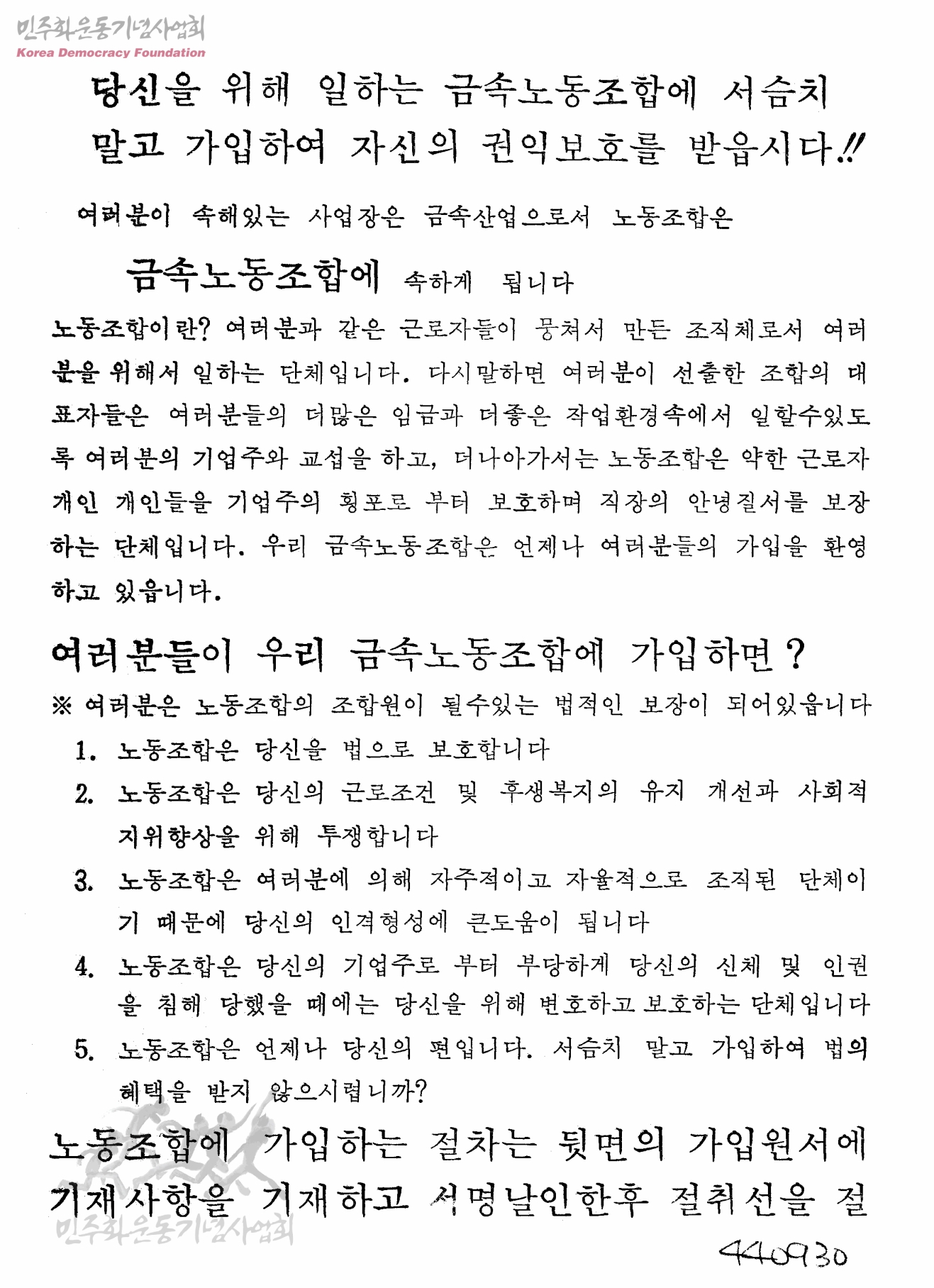당신을 위해 일하는 금속노동조합에 서슴치 말고 가입하여 자신의 권익보호를 받읍시다!!