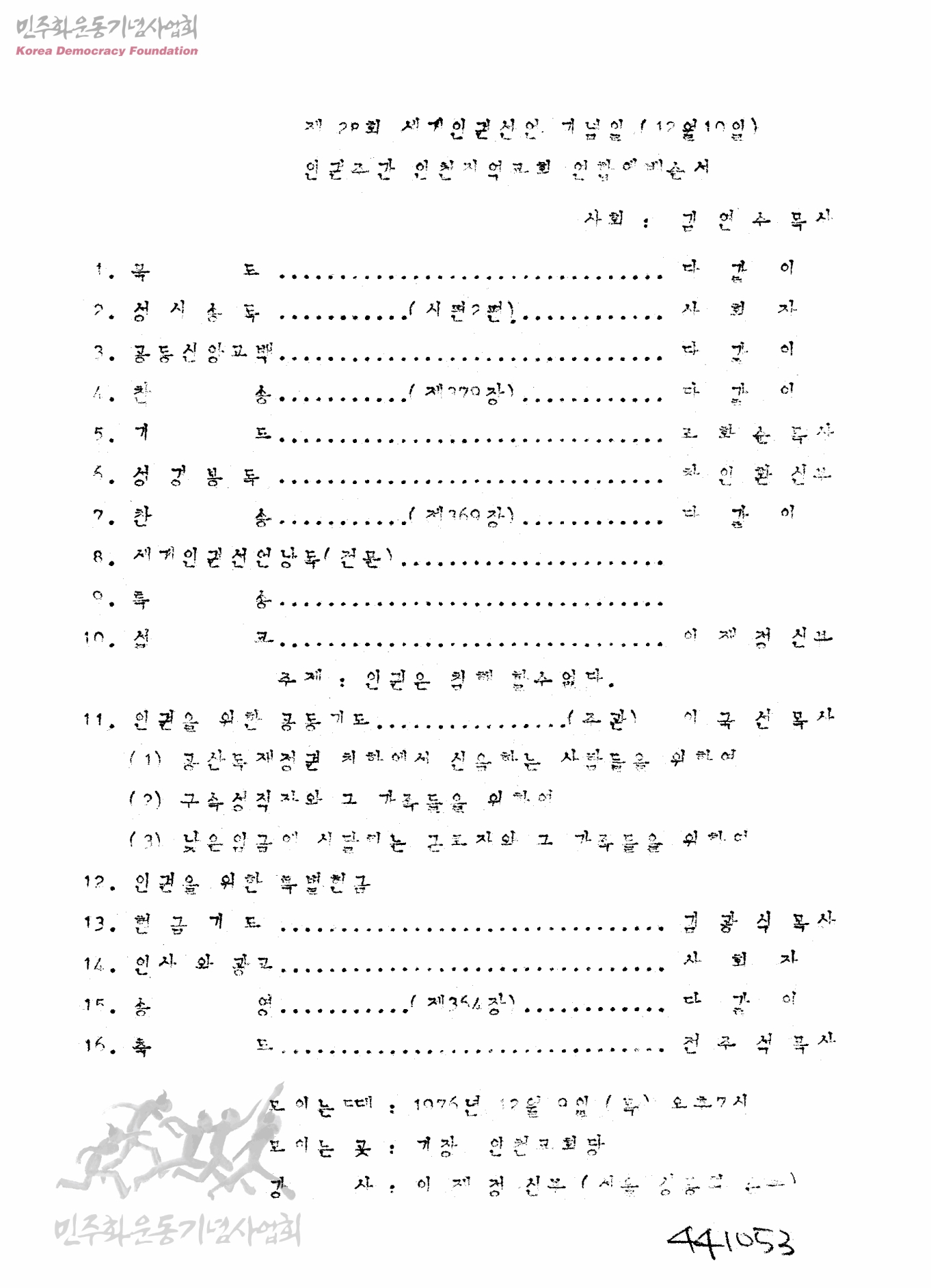 제28회 세계인권선언 기념일(12월10일) 인권주간 인천지역교회 연합예배순서
