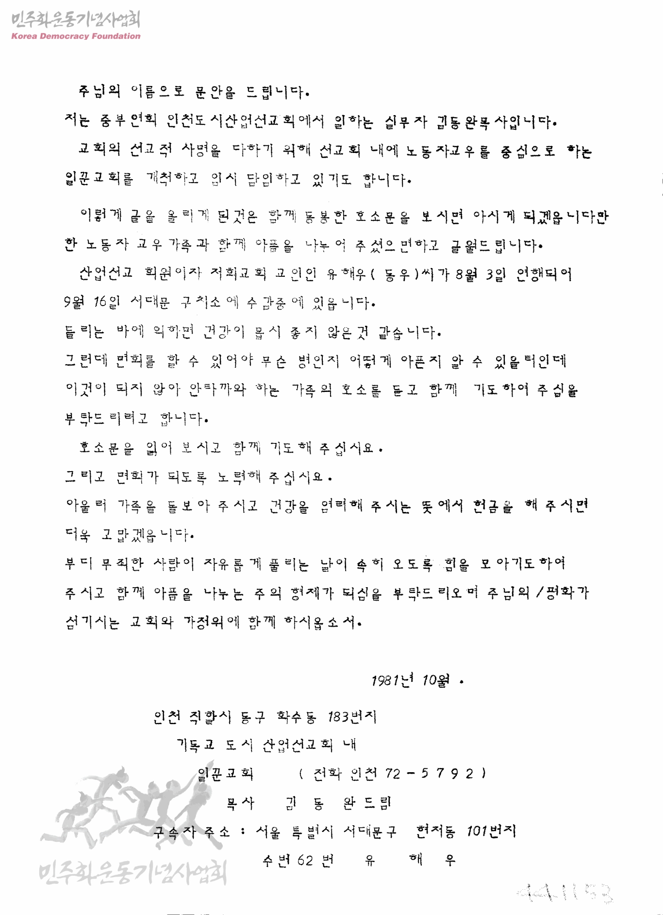 주님의 이름으로 문안을 드립니다[유해우에 대한 후원 요청]